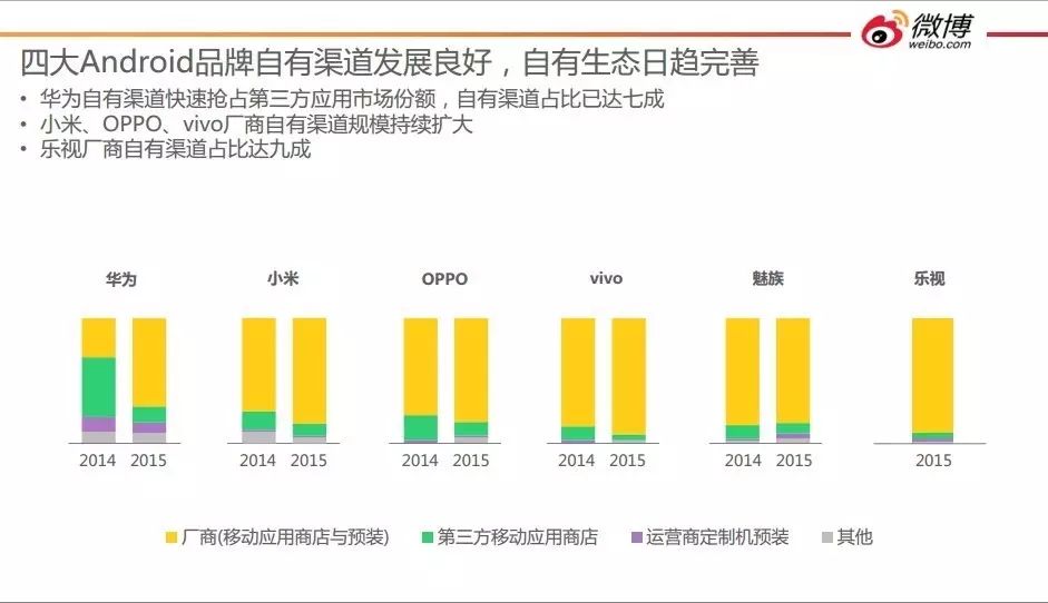 现在微报告有了最新结论:从2015年下半年来看,小米、华为、vivo、OPPO四大Android品牌自有渠道发展良好,自有生态日趋完善。其中华为自有渠道快速抢占第三方应用市场份额,自有渠道占比已达七成,小米、OPPO、vivo厂商自有渠道规模持续扩大。