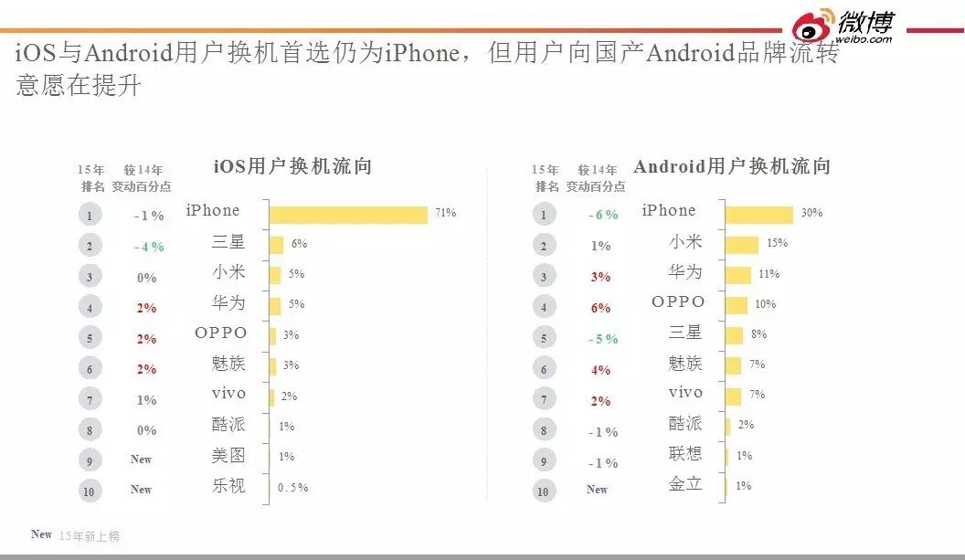 从微博数据显示的结果来看,当前,iPhone对Android用户的吸引力在下降,表现在Android用户换机时选iPhone的比率由14年的36%下降到15年的30%,主要流向国产Android品牌。与此同时,iPhone自身用户留存也出现了1%的下降,这似乎是近些年来第一次出现的人状况。