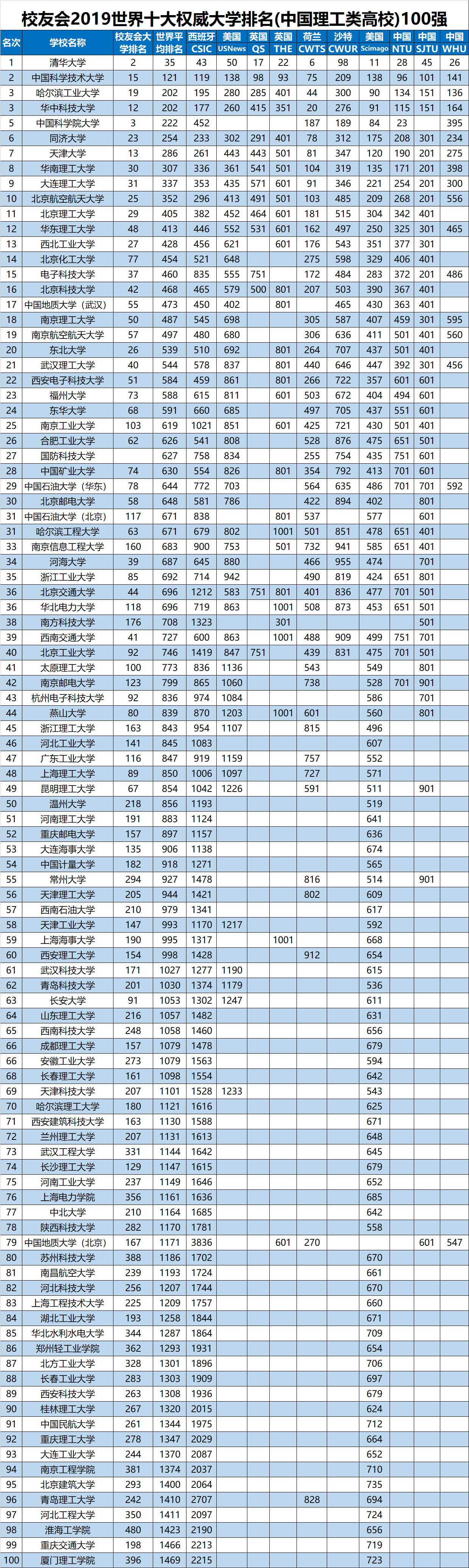 2019年5月22日,艾瑞深中国校友会网(Cuaa.Net)首次公布《校友会2019世界大学排名分析报告》,报告依据2018-2019年英国QS、英国THE、美国USNews、美国Scimago、西班牙CSIC、荷兰CWTS、沙特CWUR、中国NTU、中国SJTU和中国WHU等全球公认的世界十大权威大学排名评价结果,最新发布校友会2019世界十大权威大学排名(中国理工类大学)等排名。报告显示,在2018-2019年世界十大权威大学排名中,中国共有891所高校上榜;全国19所理工类大学跻身世界500强,60所高校跻身世界1000强。清华大学、中国科学技术大学、哈尔滨工业大学跻身校友会2019世界十大权威大学排名(中国理工类大学)前3强。