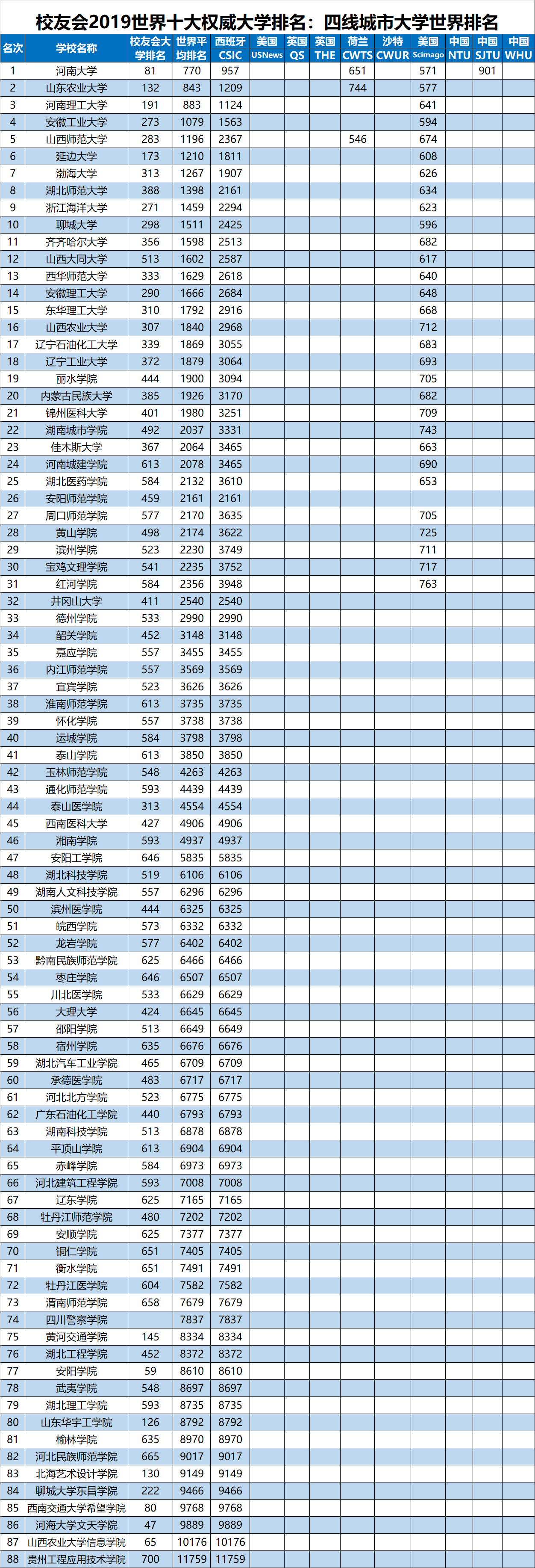 近日,艾瑞深中国校友会网(Cuaa.Net)首次公布《校友会2019世界大学排名分析报告》,依据2018-2019年英国THE、英国QS、美国USNews、西班牙CSIC、沙特CWUR、荷兰CWTS、美国Scimago、中国SJTU、中国NTU和中国WHU等全球公认的世界十大权威大学排名的结果,最新发布校友会2019世界十大权威大学排名(中国各区域大学)等榜单。报告显示,在2018-2019年世界十大权威大学排名中,中国七大区域共有891所大学上榜,清华大学、北京大学雄居2019中国大学排名冠亚军,跻身跻身世界50强;中国四线城市无高校跻身世界500强,2所高校跻身世界1000强,21所高校跻身世界2000强。河南大学、山东农业大学、河南理工大学排名校友会2019世界十大权威大学排名(中国四线城市大学)前3名。