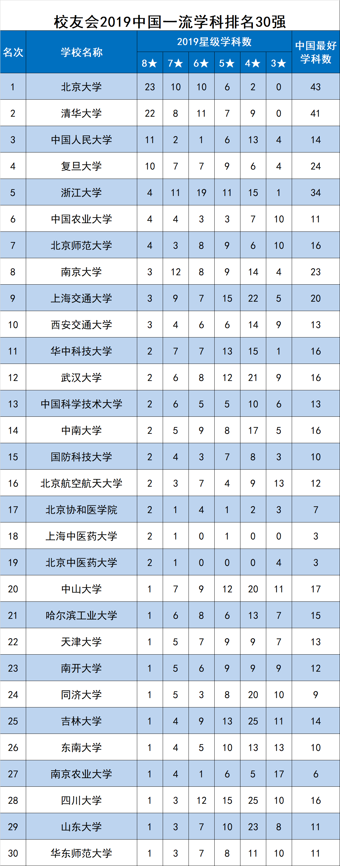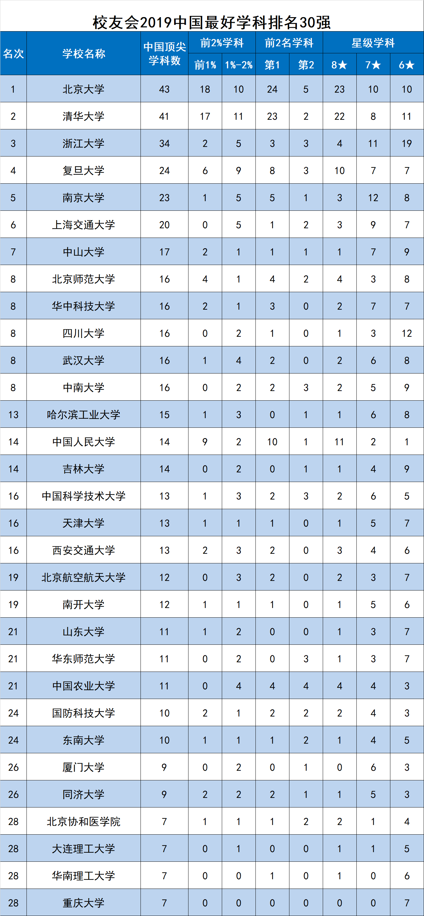 报告显示,在最新校友会2019中国最好学科排名中,北京大学共有43个学科跻身2019中国八星级(8)、七星级(7)和六星级(6)学科,全国前2%学科和全国前2名学科,中国顶尖学科数量全国最多,雄居艾瑞深中国校友会网2019中国最好学科排名榜首,学科整体办学实力最强。清华大学41个,列第2;浙江大学34个,居第3;复旦大学24个,列第4;南京大学23个,居第5;上海交通大学20个,列第6;中山大学17个,居第7;北京师范大学、华中科技大学、四川大学、武汉大学、中南大学各16个,并列第8。