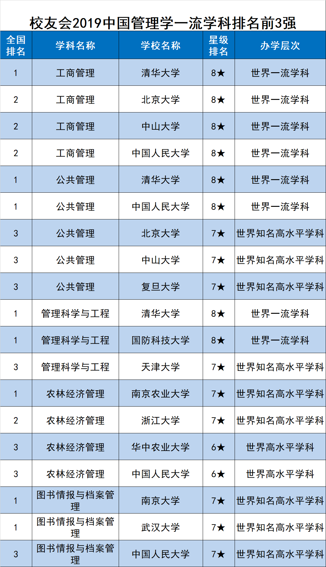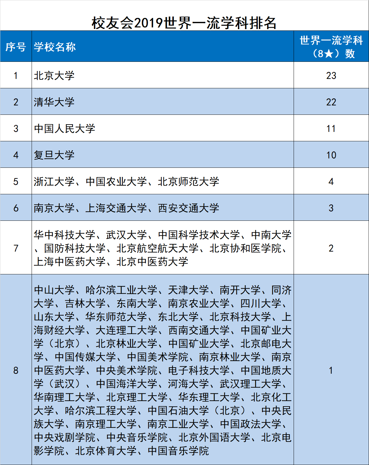 2019年11月27日,艾瑞深中国校友会网(cuaa.net)正式发布《2019中国双一流学科建设评价报告》,公布最新校友会2019中国一流学科排名、2019中国最好学科排名和2019世界一流学科排名等榜单。报告显示,中国高校双一流学科建设成效显著,学科水平与核心竞争力持续提升,全国151个学科荣膺2019中国八星级学科(8),跻身中国特色、世界一流学科行列。北京大学和清华大学的学科水平最高,整体实力全国领先;北京大学、清华大学、中国人民大学、复旦大学和浙江大学雄居2019中国一流学科排名前5强;北京大学、清华大学、浙江大学、复旦大学和南京大学雄居2019中国最好学科排名前5名。