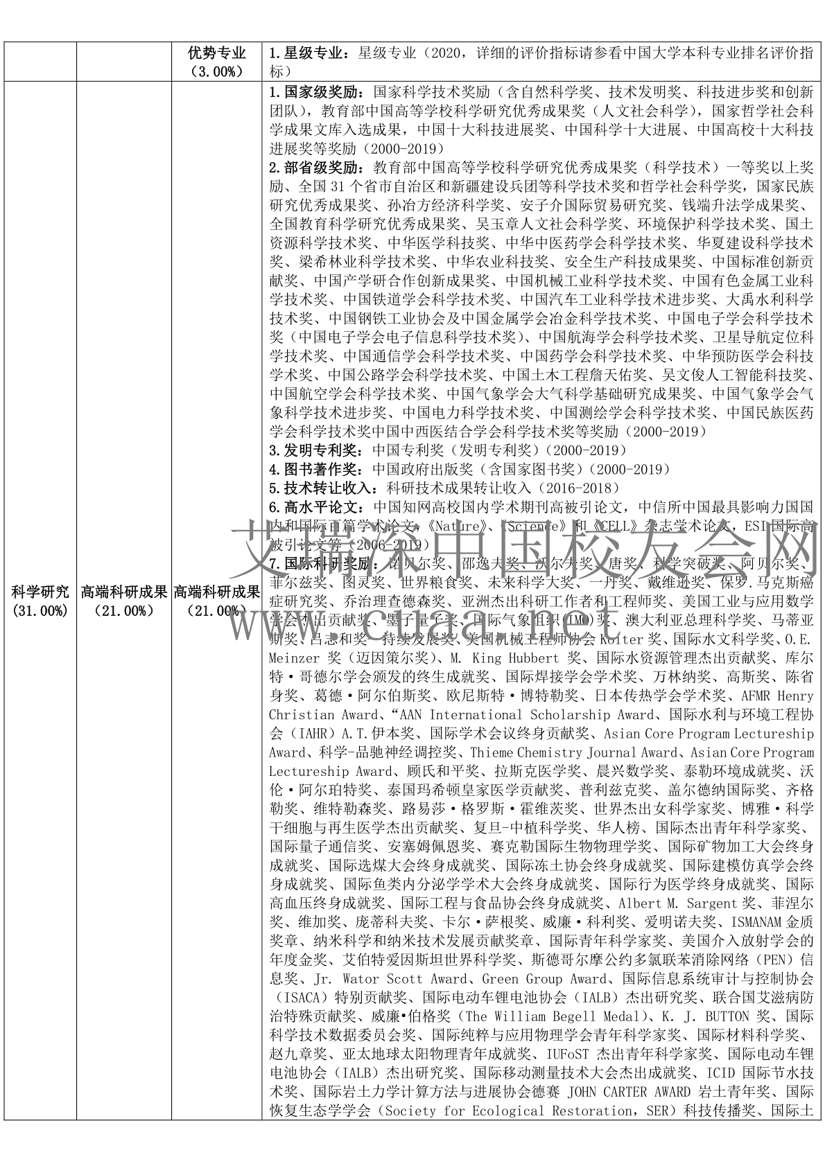 校友会2020中国大学排名评价指标权重