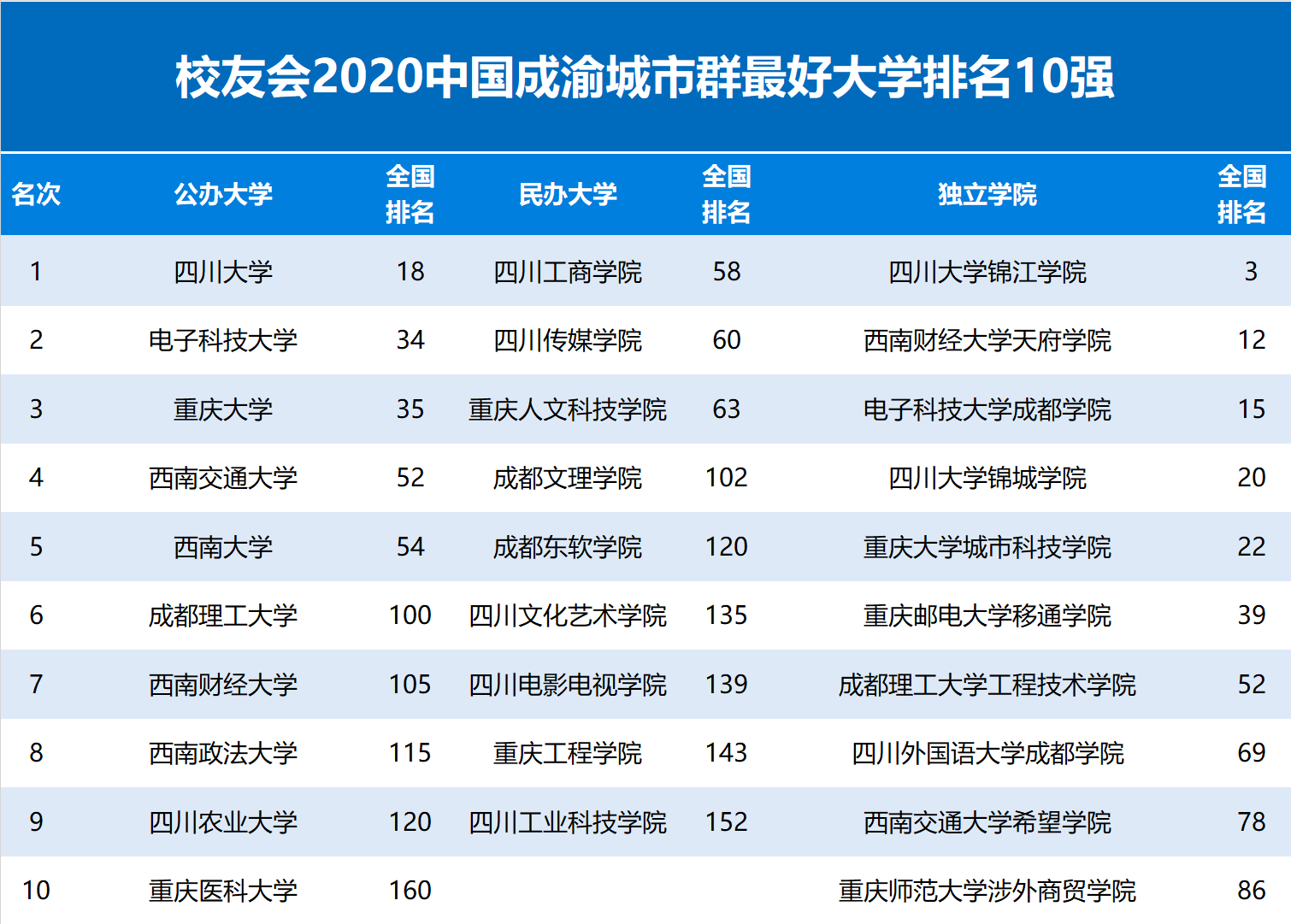 在最新艾瑞深校友会网2020中国各城市群大学排名中,四川大学、电子科技大学、重庆大学位列艾瑞深校友会2020中国成渝城市群大学排名前3强,四川工商学院、四川传媒学院、重庆人文科技学院名列艾瑞深校友会2020中国成渝城市群民办大学排名前3名,四川大学锦江学院、西南财经大学天府学院、电子科技大学成都学院位居艾瑞深校友会2020中国成渝城市群独立学院排名前3甲。