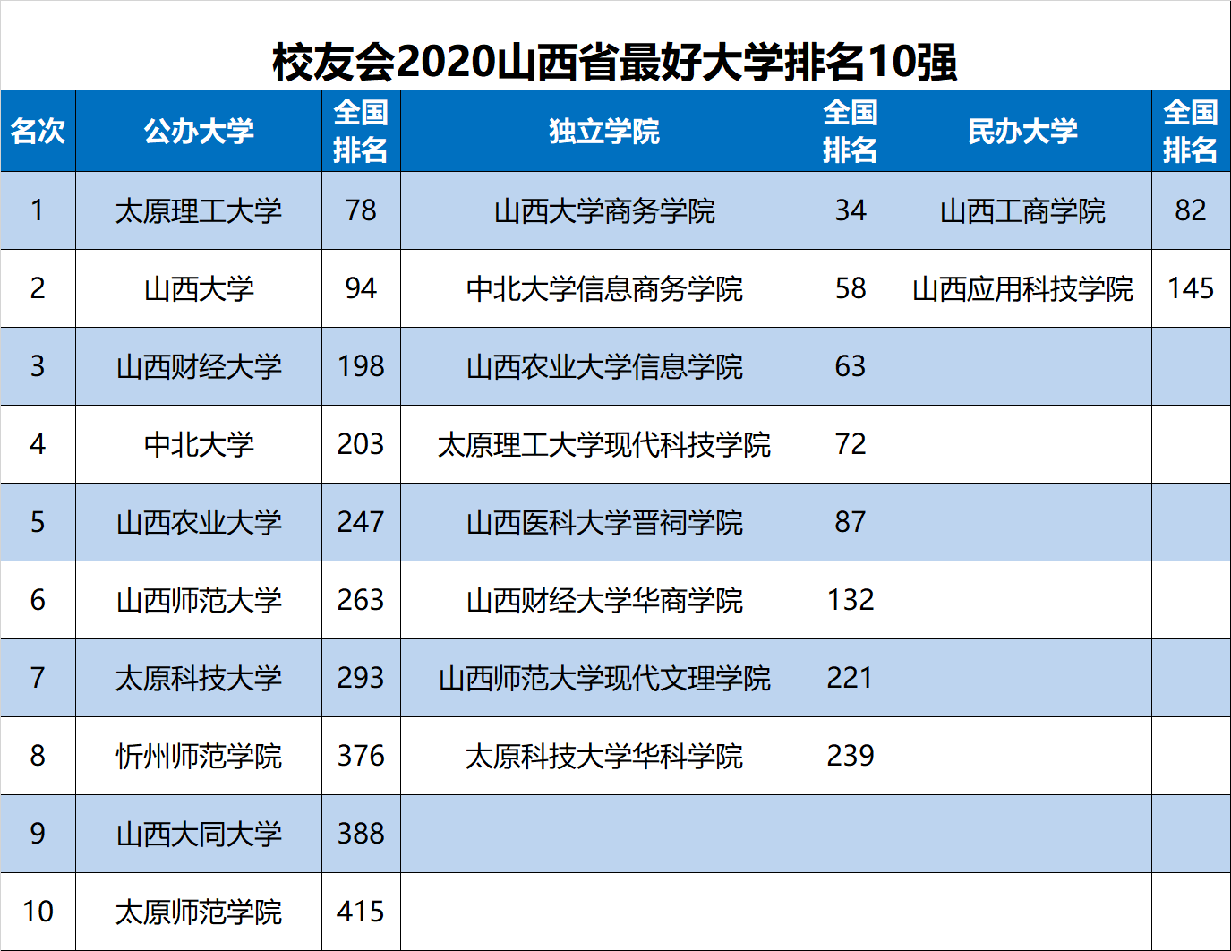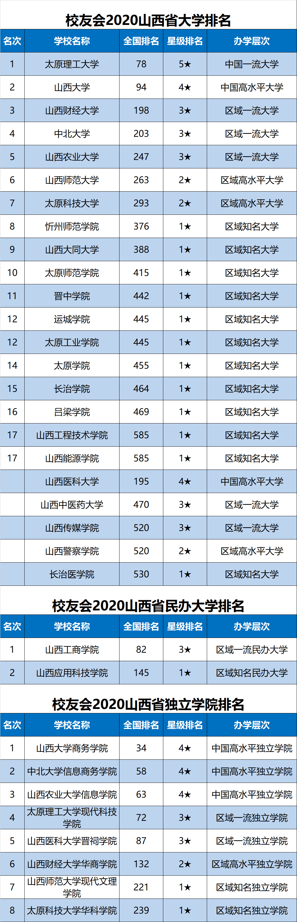 在艾瑞深校友会网2020中国大学排名1200强中,太原理工大学、山西大学、山西财经大学、中北大学、山西农业大学、山西师范大学、太原科技大学、忻州师范学院、山西大同大学、太原师范学院、雄居校友会2020山西省大学排名前10强。