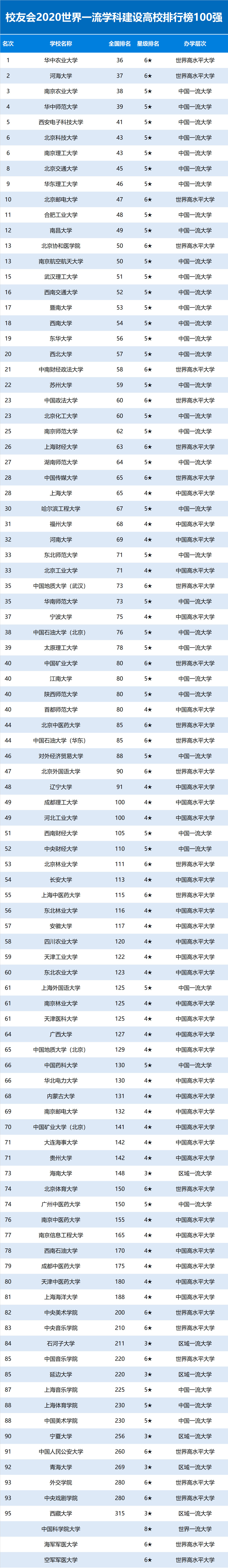 榜单显示,在最新2020校友会世界一流学科建设高校排行榜中,位列校友会2020中国大学排名前40强的大学为:华中农业大学、河海大学、南京农业大学、华中师范大学。位居第41名至第50名的大学为:西安电子科技大学、北京科技大学、南京理工大学、北京交通大学、华东理工大学、北京邮电大学、合肥工业大学、南昌大学、北京协和医学院、南京航空航天大学。