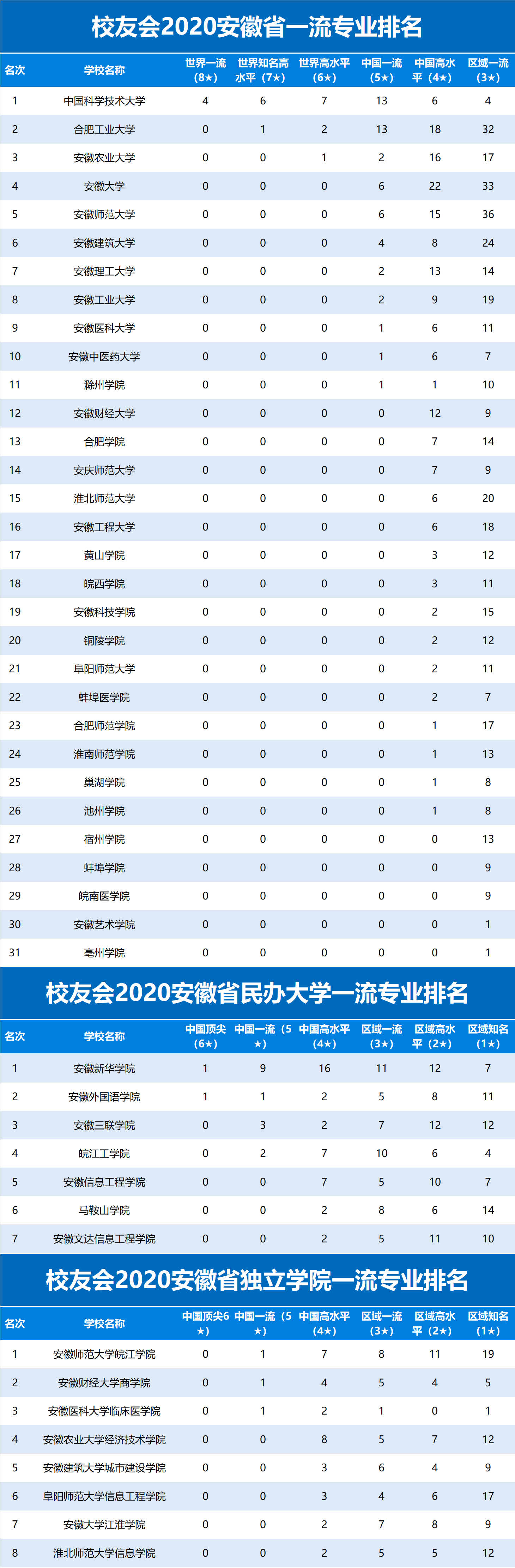 校友会2020安徽省一流专业排名,中国科学技术大学第1,安徽大学第4