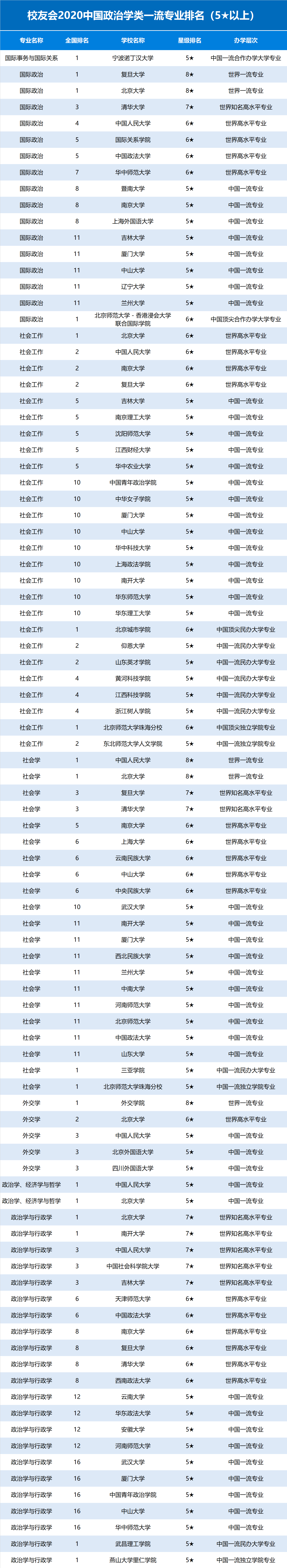 校友会2020中国政治学类一流专业排名(5以上)