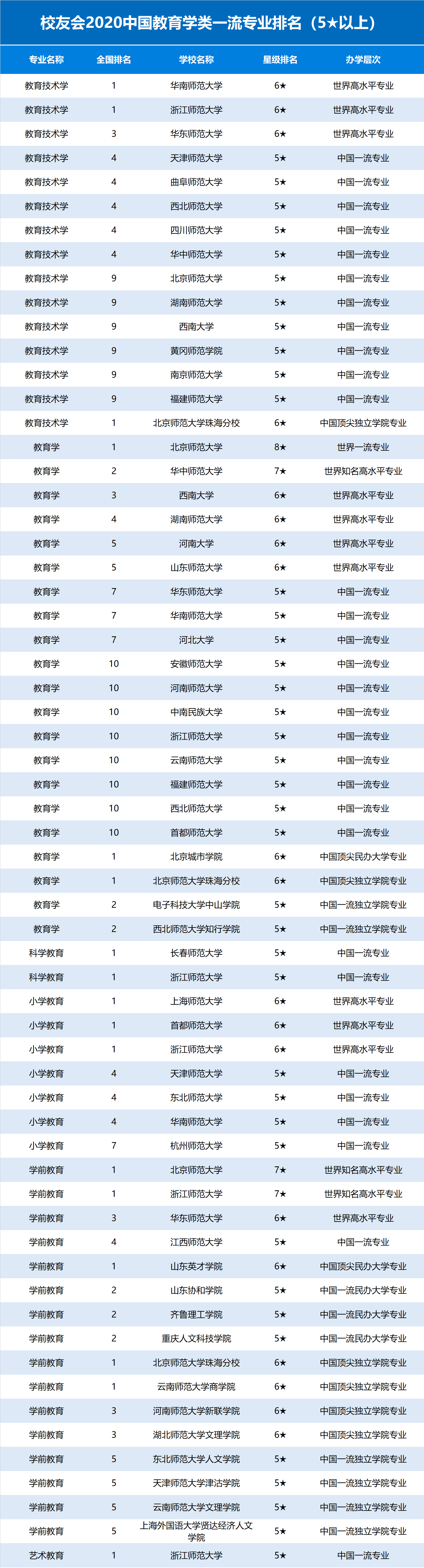 校友会2020中国教育学类一流专业排名(5以上)