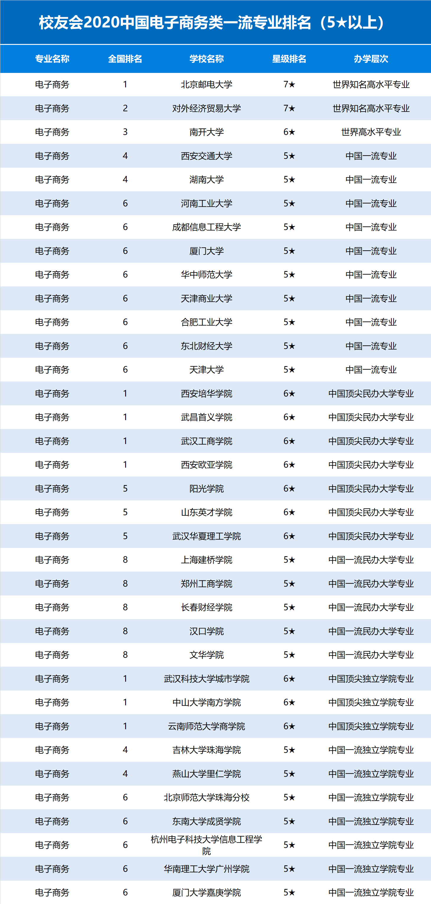 校友会2020中国电子商务类一流专业排名(5以上)