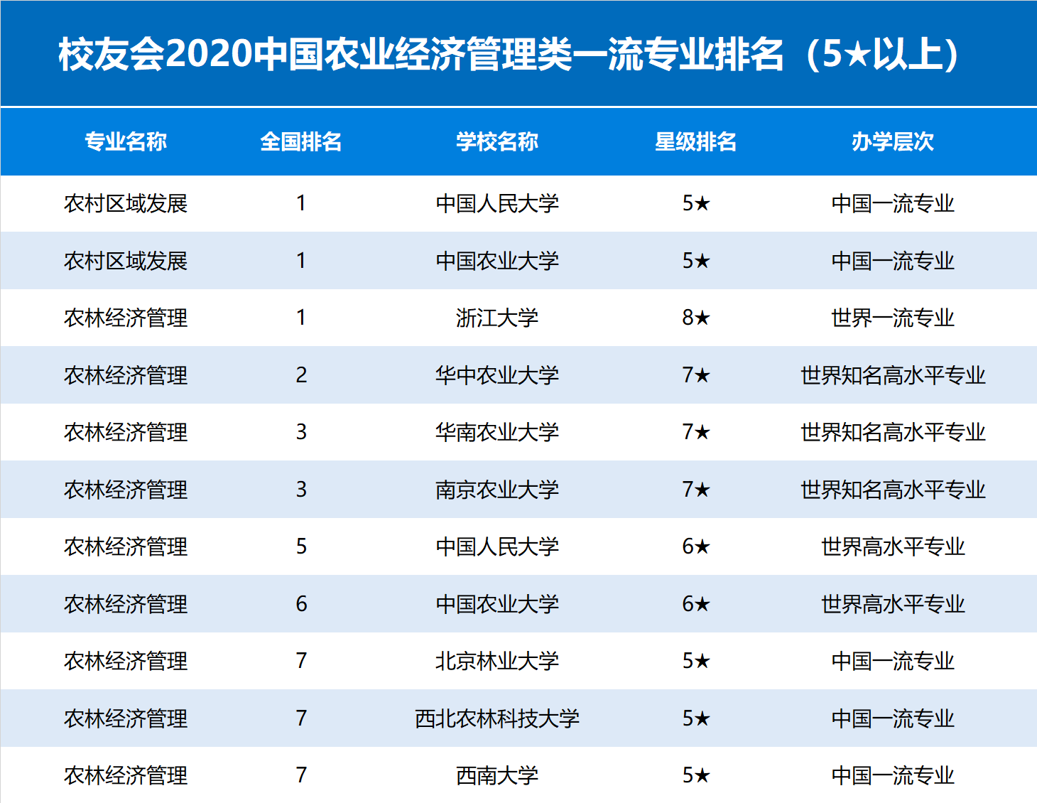 校友会2020中国农业经济管理类一流专业排名(5以上)