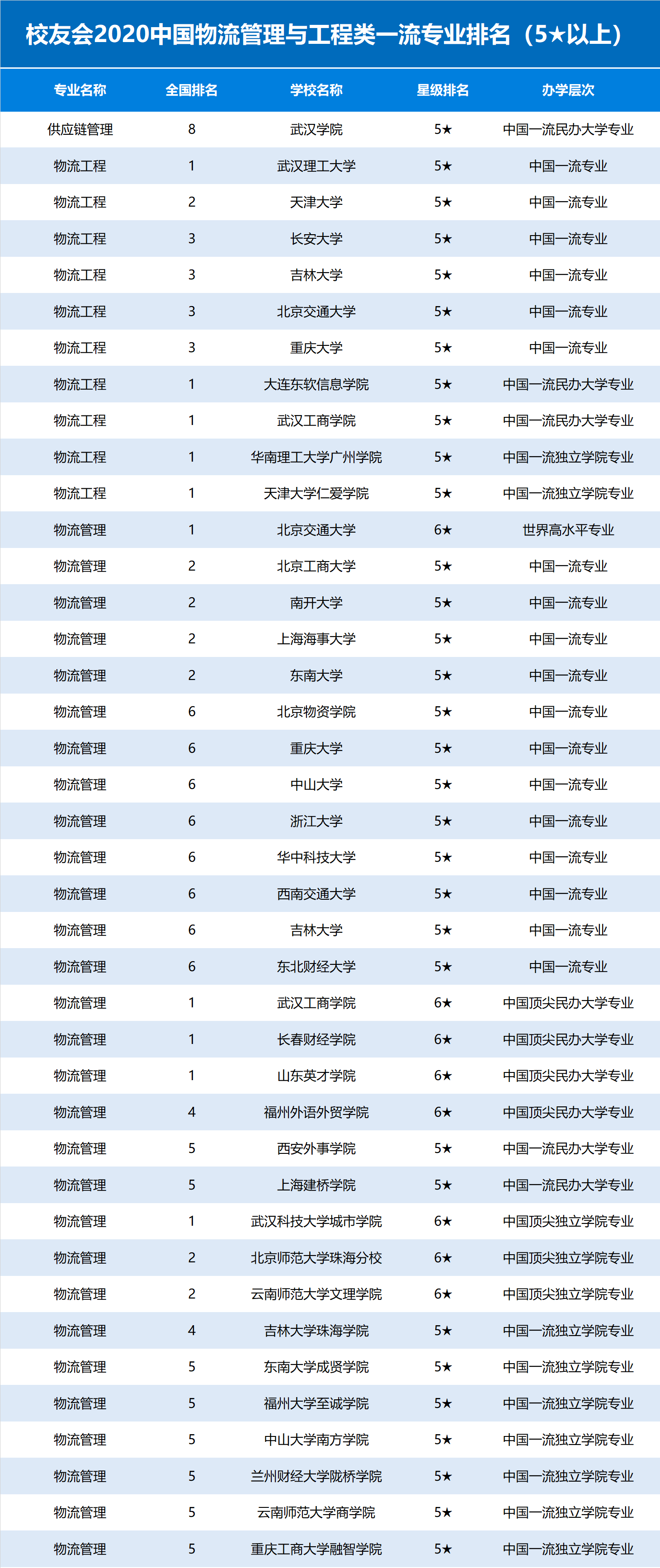 校友会2020中国物流管理与工程类一流专业排名(5以上)