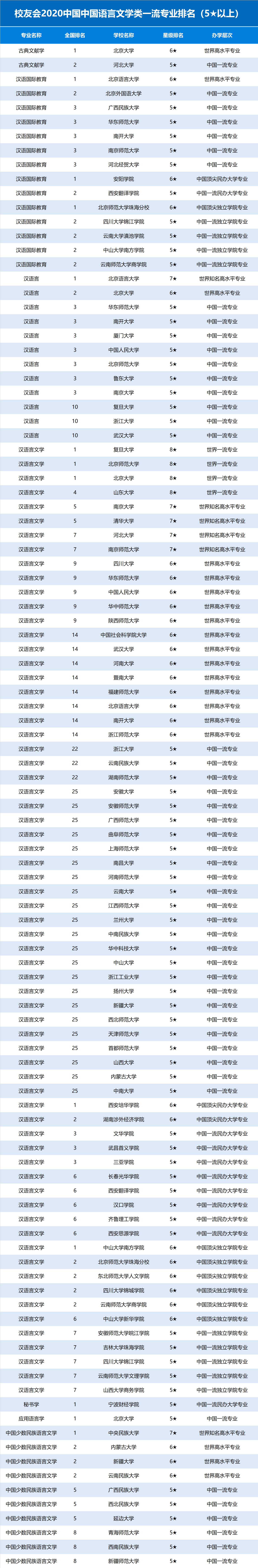 校友会2020中国中国语言文学类一流专业排名(5以上)