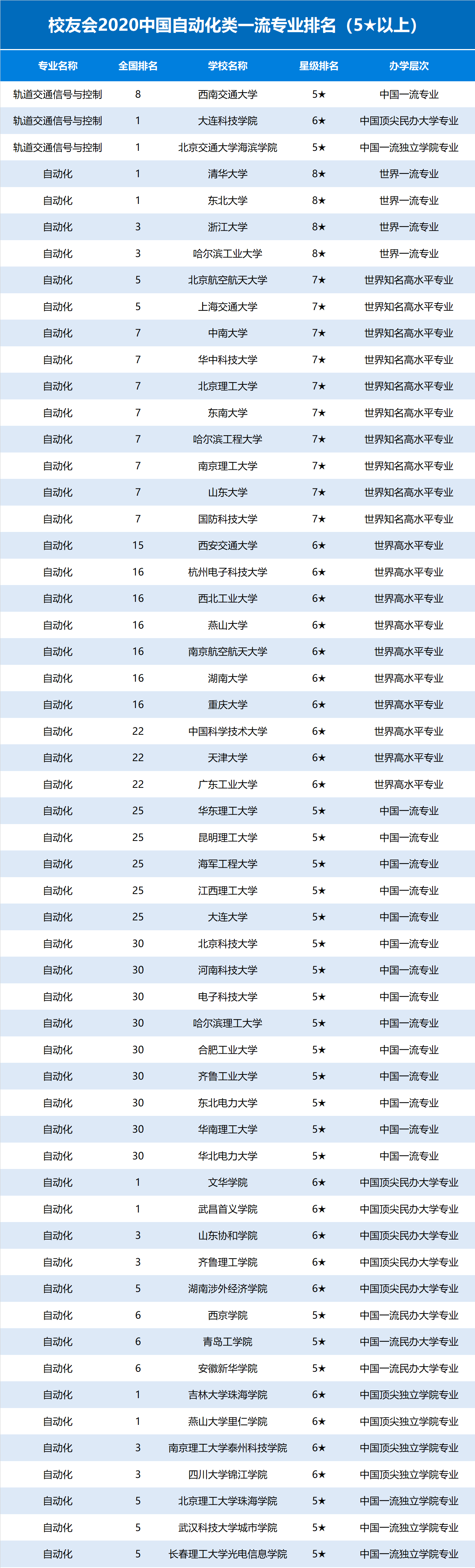 校友会2020中国自动化类一流专业排名(5以上)