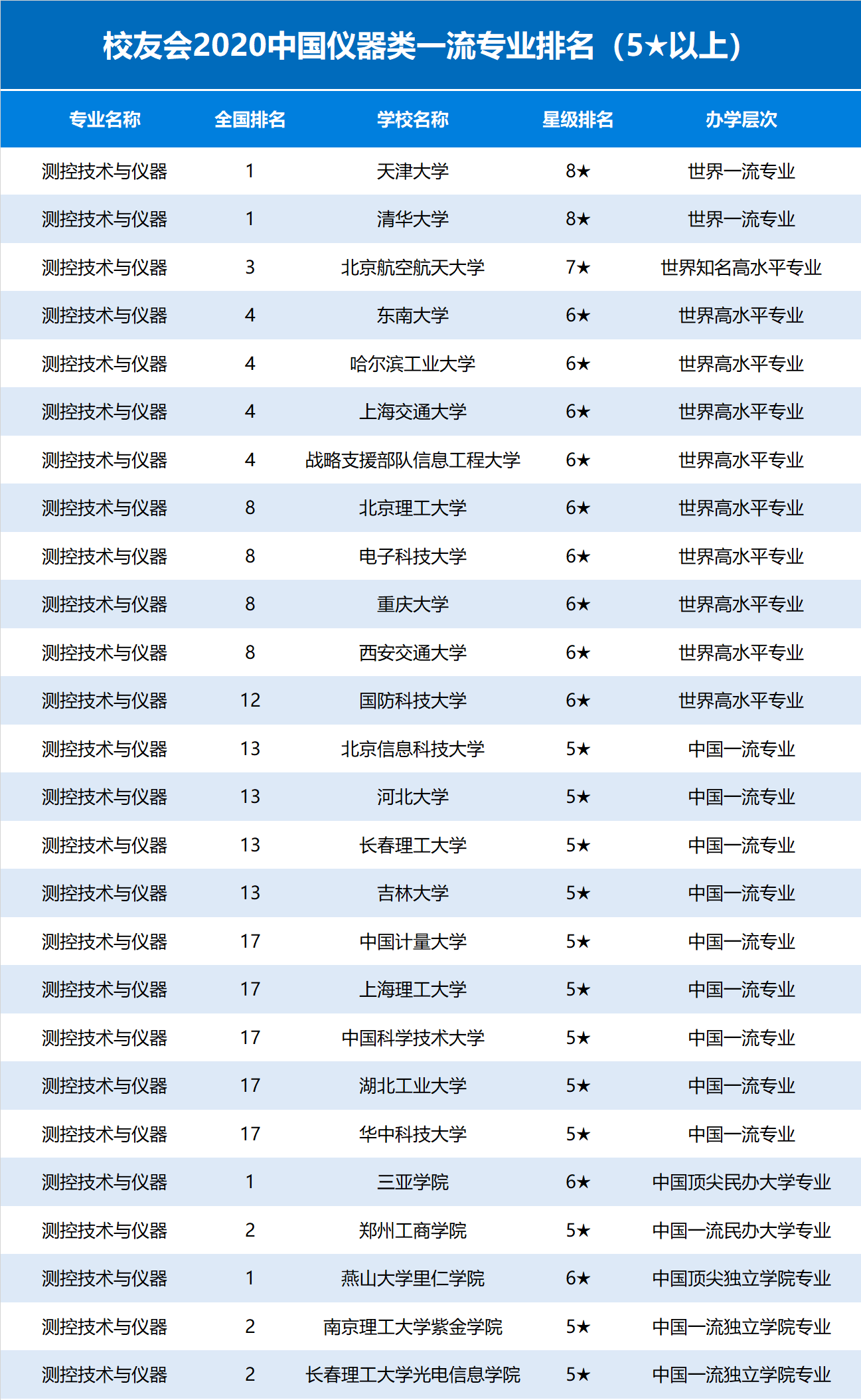 校友会2020中国仪器类一流专业排名,清华大学第一