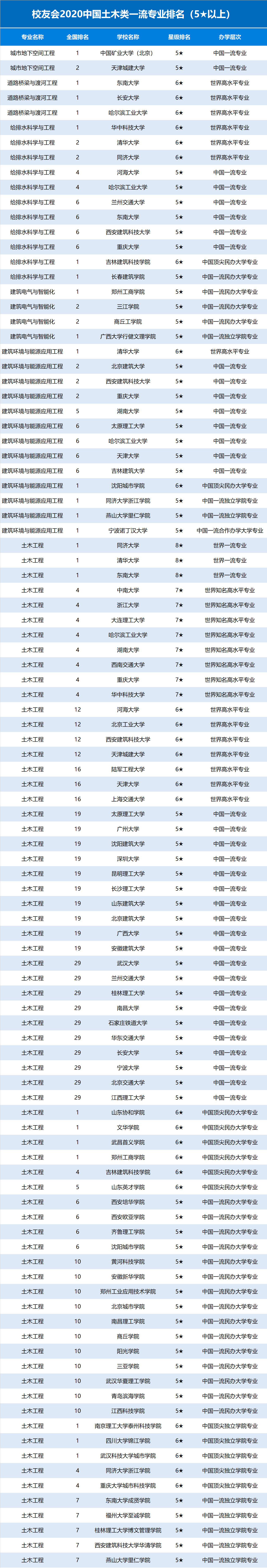 校友会2020中国土木类一流专业排名(5以上)