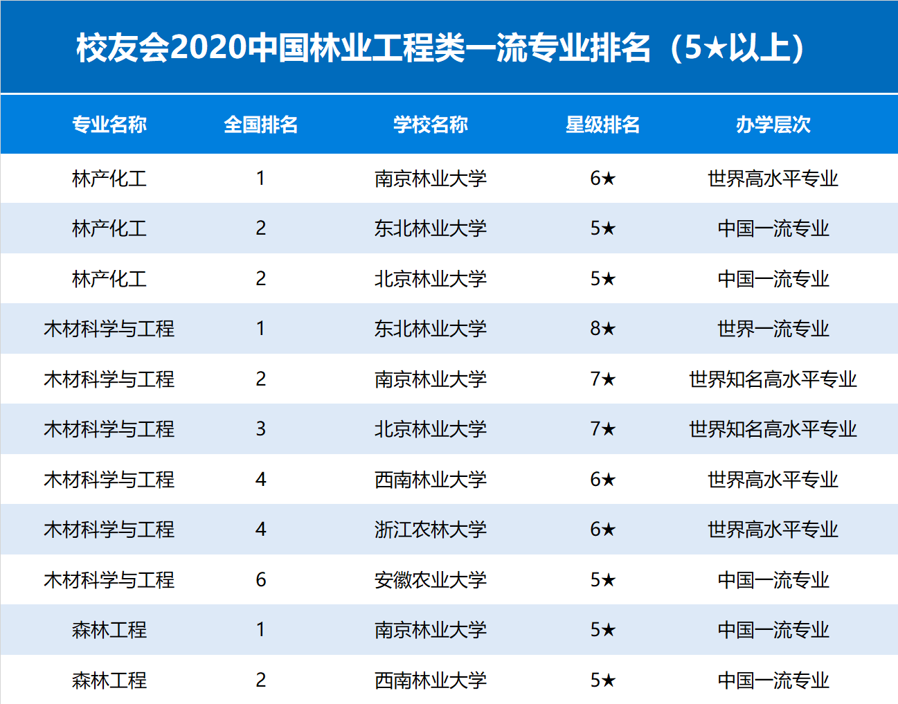 校友会2020中国林业工程类一流专业排名(5以上)