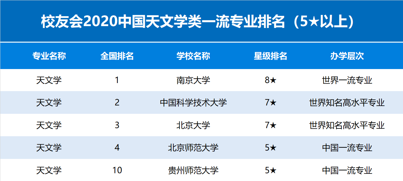 校友会2020中国天文学类一流专业排名(5以上)