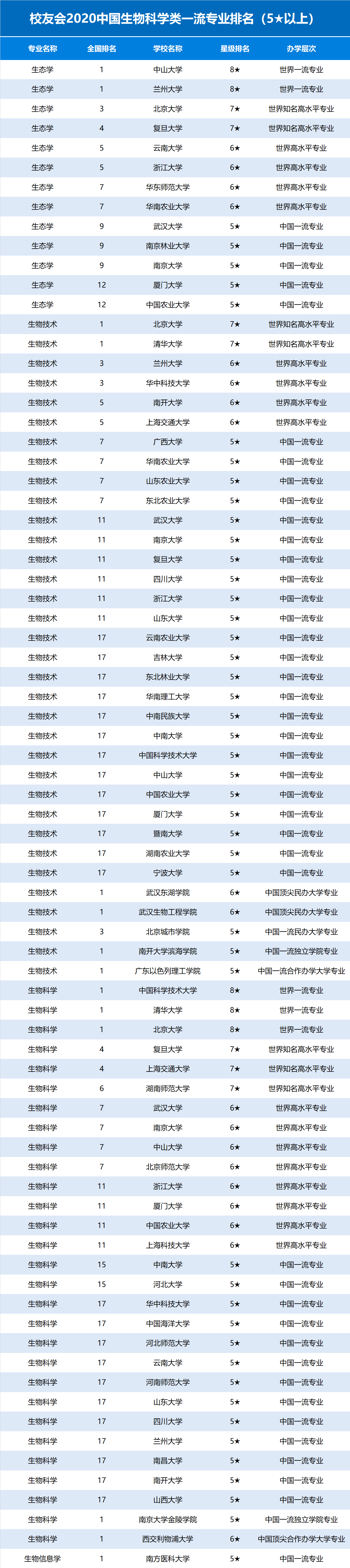 校友会2020中国生物科学类一流专业排名(5以上)