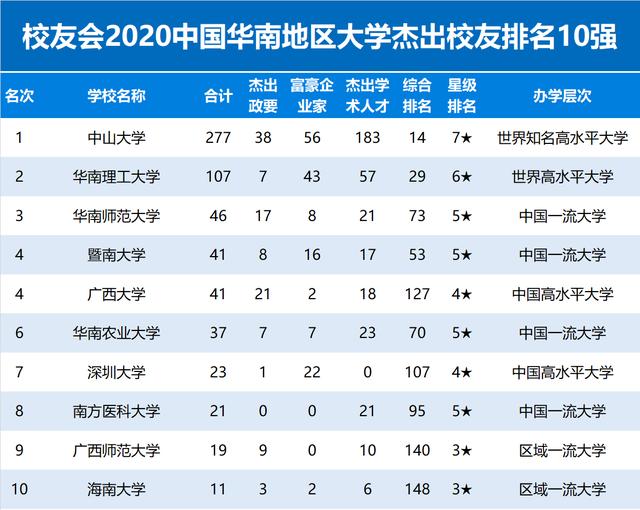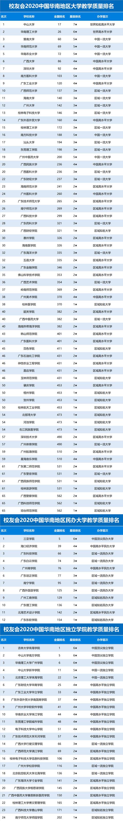 校友会2020中国华南地区大学教学质量排名,中山大学第一