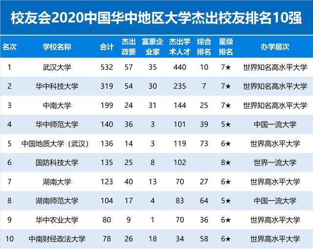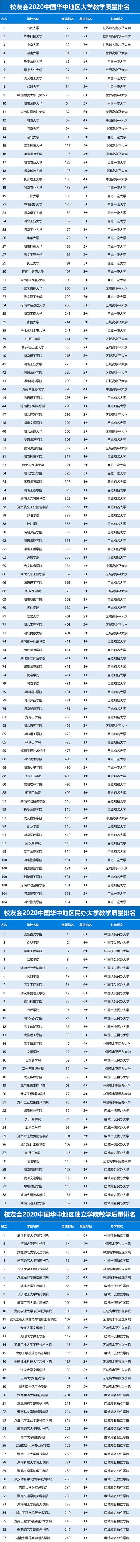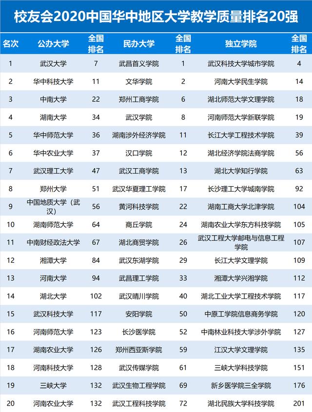 校友会2020中国华中地区大学教学质量排名,武汉大学第一
