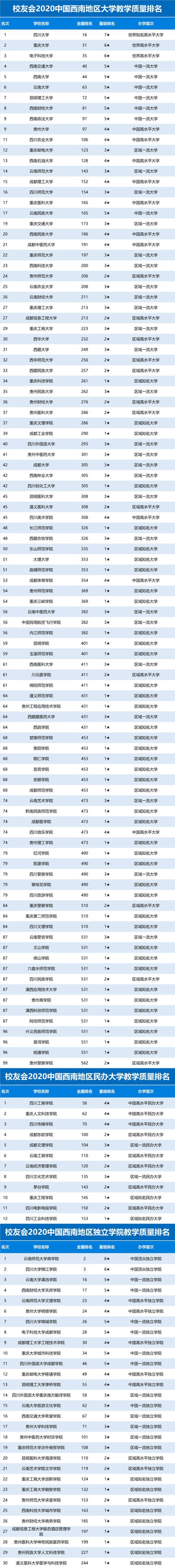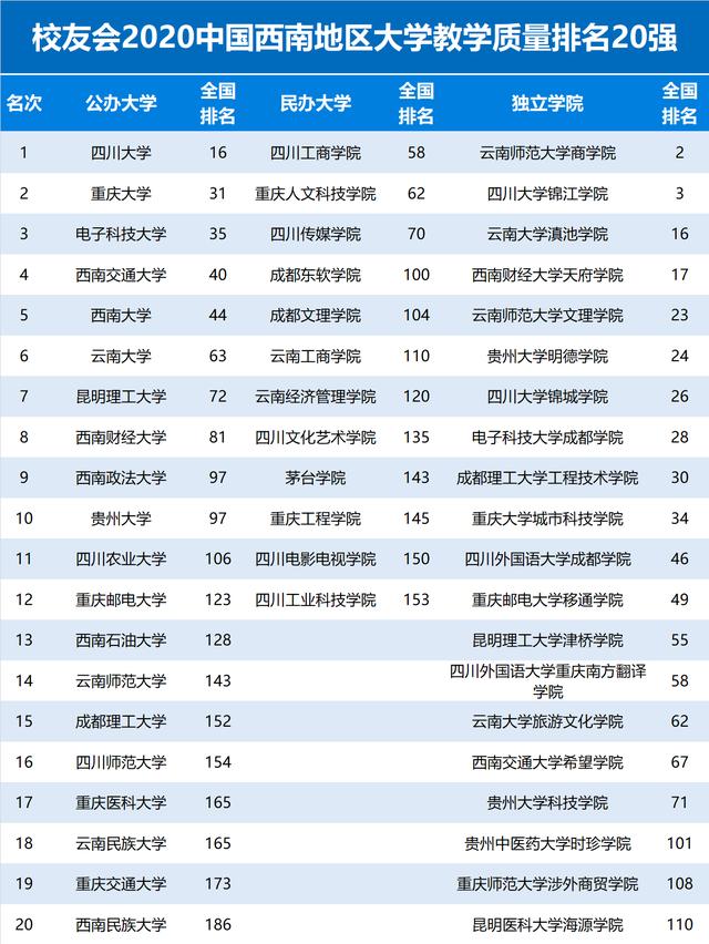 校友会2020中国西南地区大学教学质量排名,四川大学第一