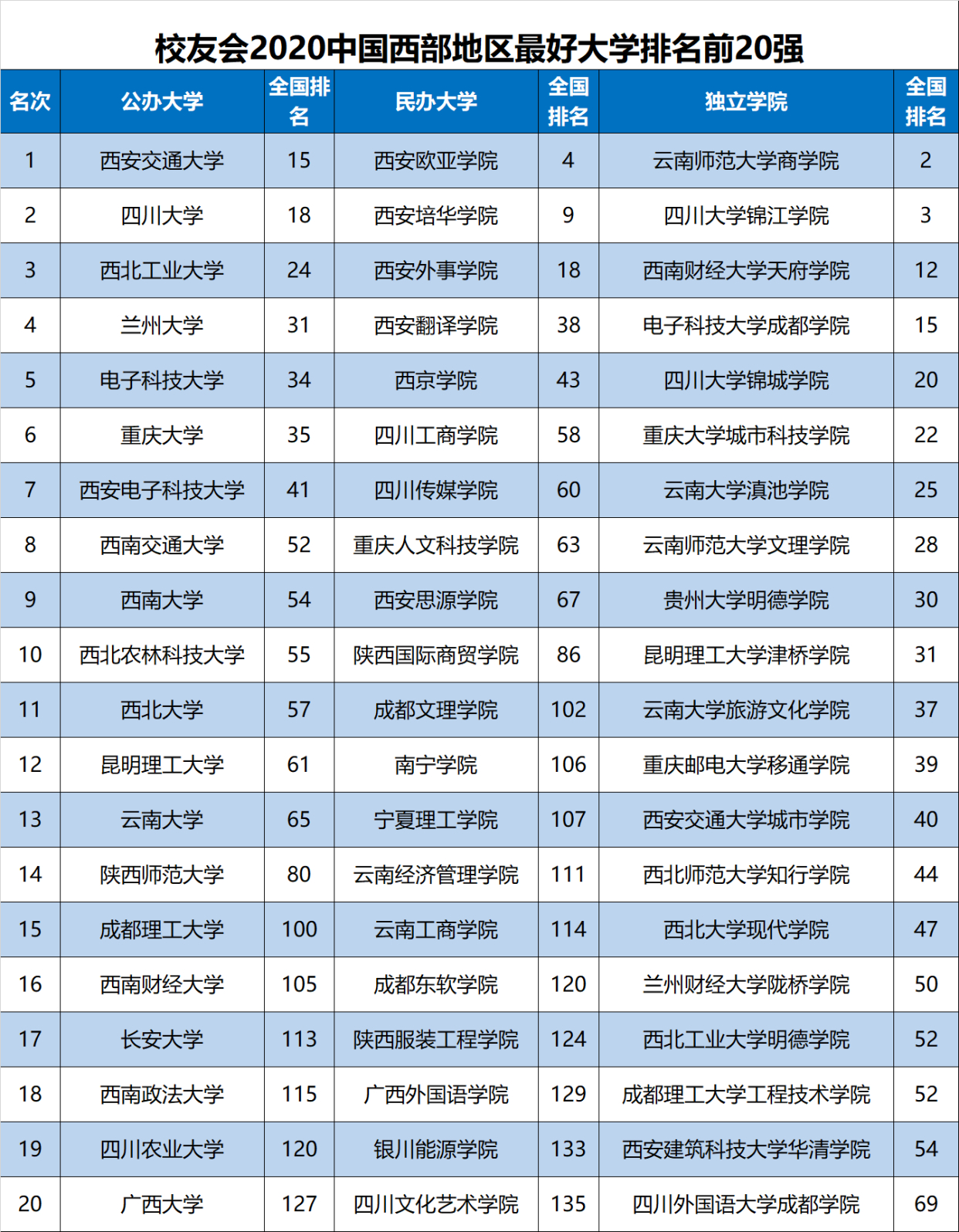 西安交通大学、西安欧亚学院、云南师范大学商学院分列2020年中国西部地区大学、民办大学、独立学院排名第一。