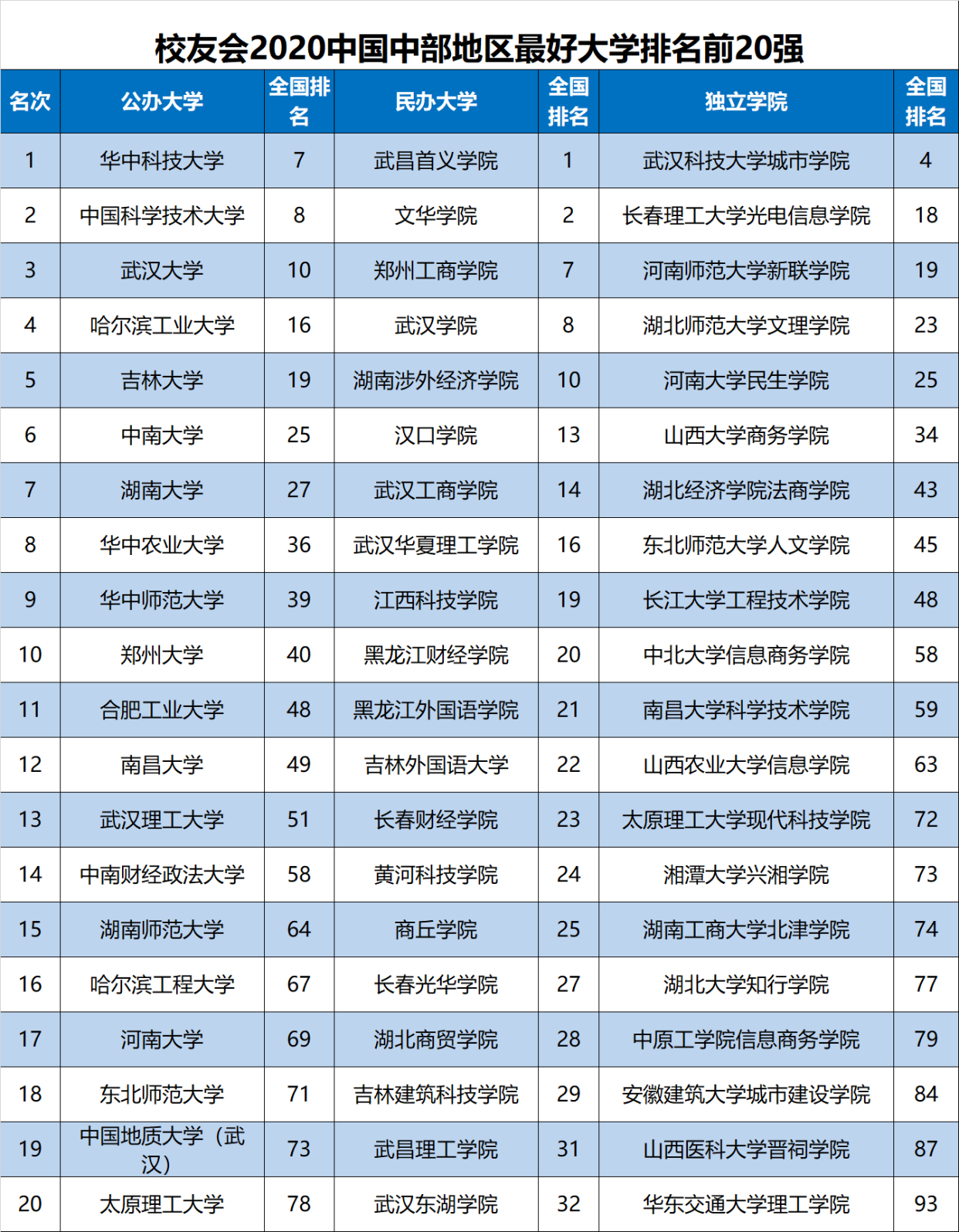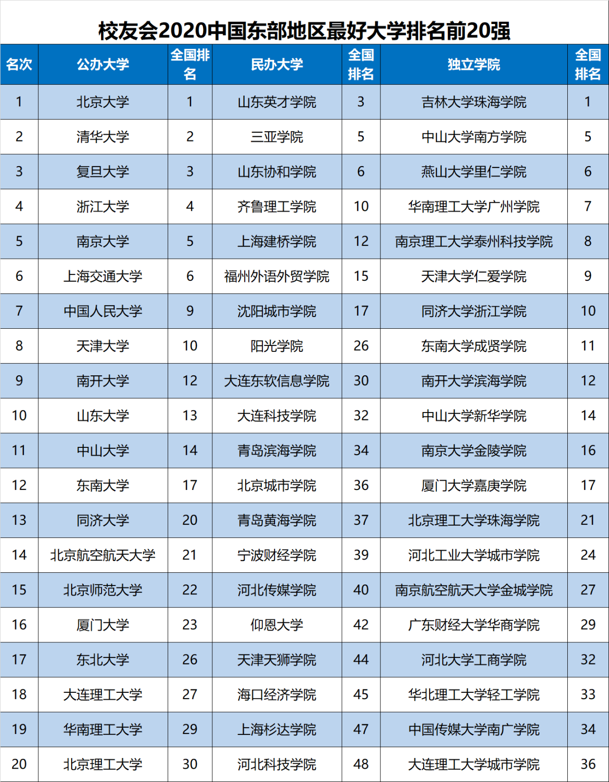 谁是2020年全国东部、中部、西部地区的最好高校?哪些高校跻身2020校友会中国大学排名10强?