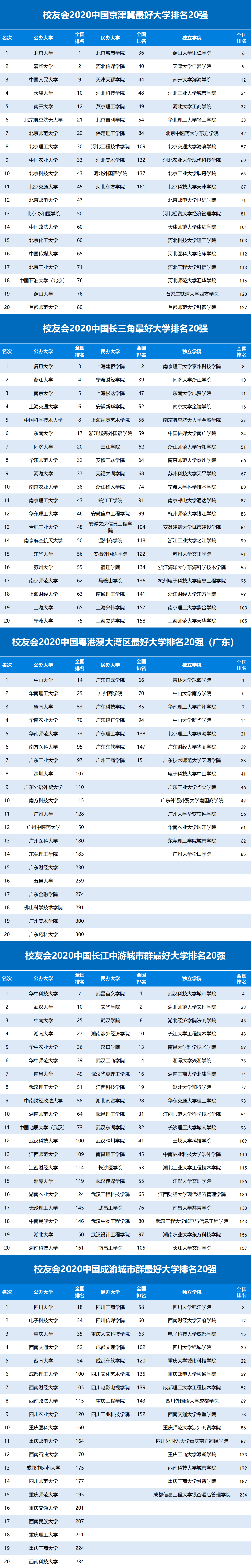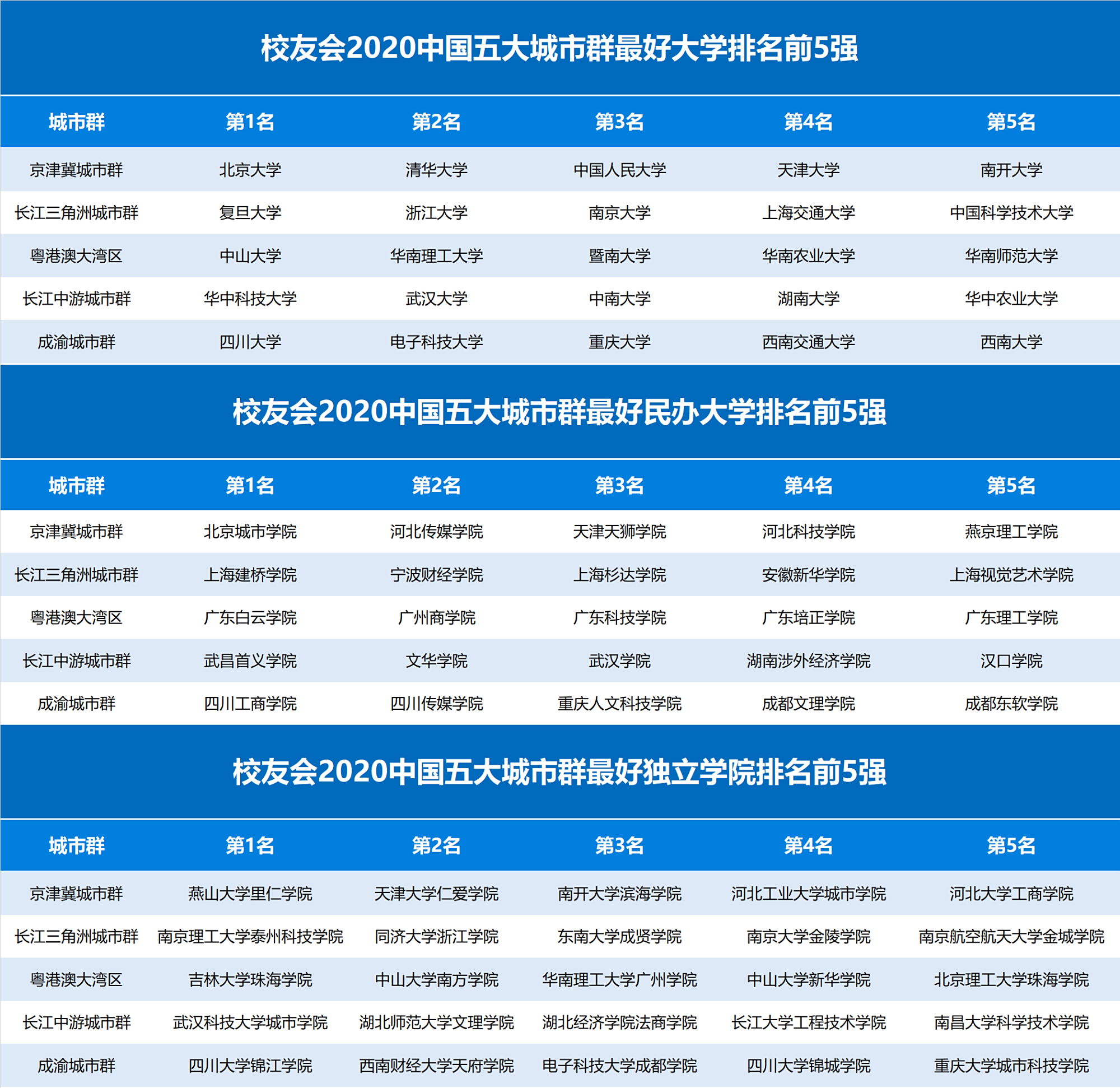 报告公布最新校友会2020中国京津冀城市群、长江三角洲城市群、粤港澳大湾区、长江中游城市群、成渝城市群最好大学排名等系列排名。
