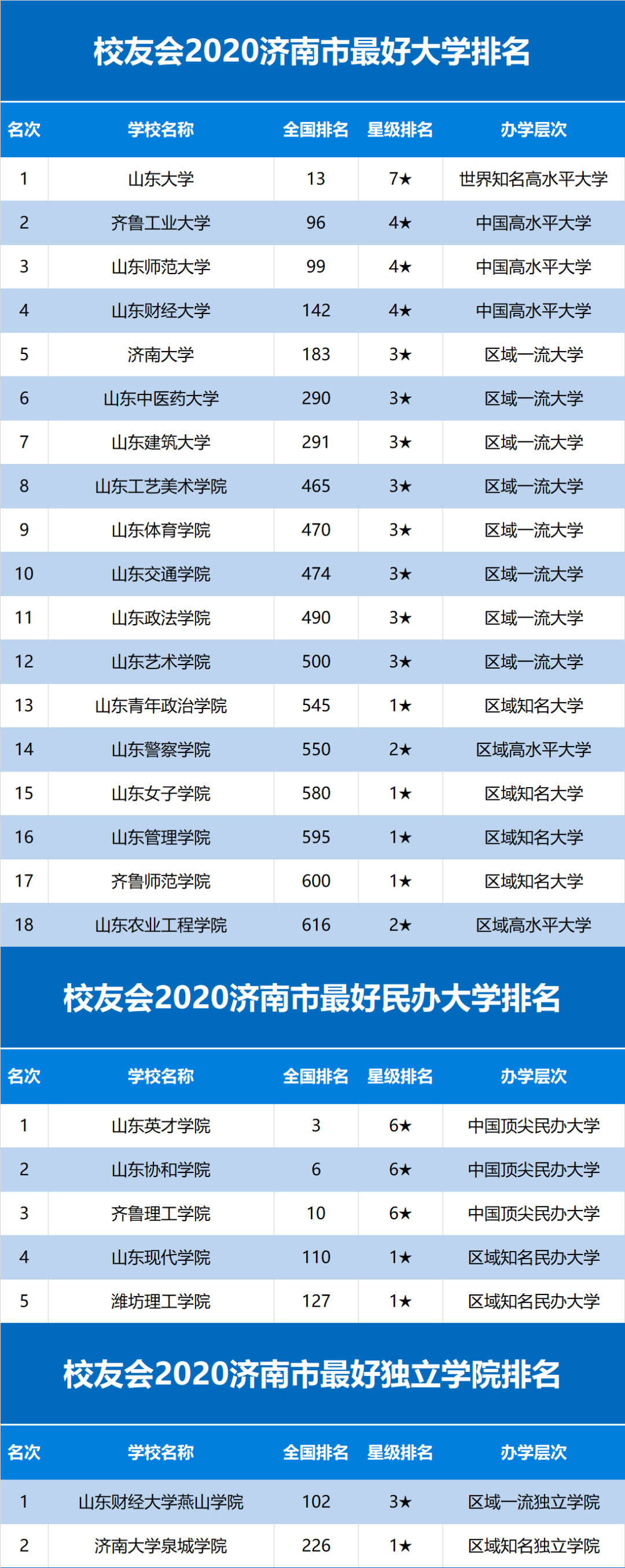在校友会2020中国大学排行榜1200强中,华中科技大学、武昌首义学院和武汉科技大学城市学院高居2020武汉市大学、民办大学和独立学院排名第1。山东大学、山东英才学院、山东财经大学燕山学院位列校友会2020济南市大学、民办大学和独立学院排名第1。