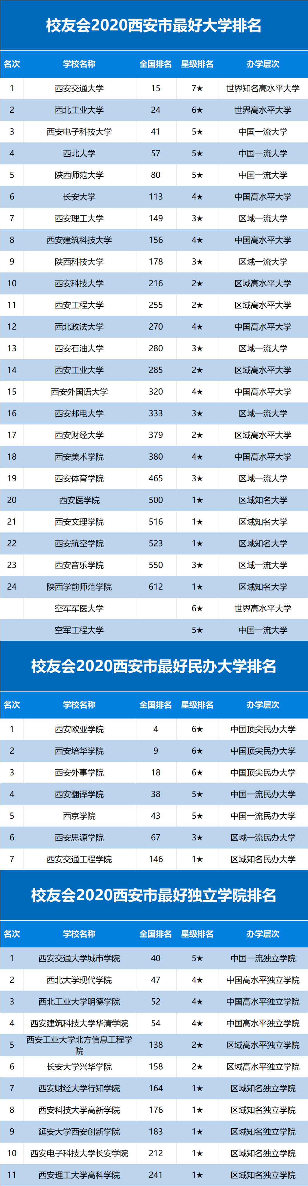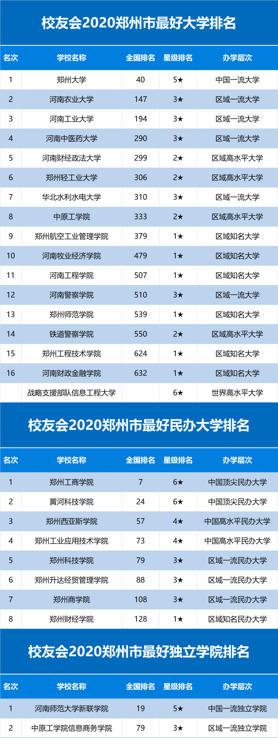 郑州大学、郑州工商学院和河南师范大学新联学院居校友会2020郑州市大学、民办大学和独立学院排名第1。西安交通大学、西安欧亚学院和西安交通大学城市学院分列2020西安市大学、民办大学和独立学院排名第一。中南大学、湖南涉外经济学院和湖南工商大学北津学院列校友会2020长沙市大学、民办大学和独立学院排名第1。