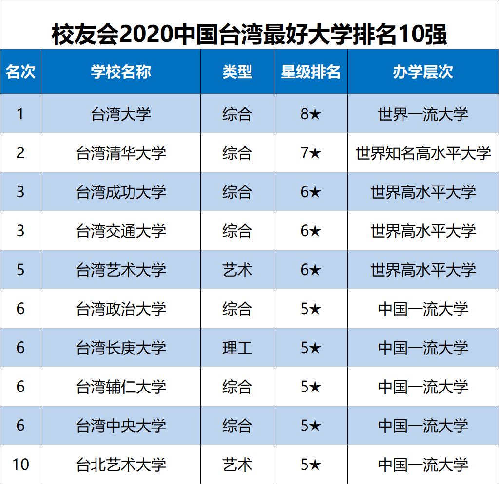 台湾大学荣膺2020年中国八星级大学(8),跻身2020年年世界一流大学行列,雄居校友会2020年中国台湾最好大学排名榜首。
