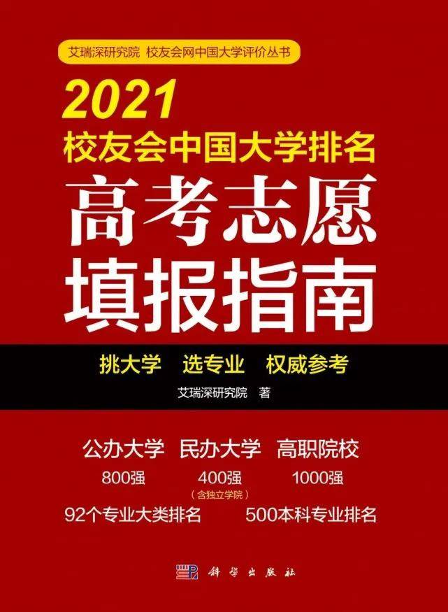 2021年3月,全国第三方大学评价研究机构艾瑞深校友会网(cuaa.net)正式发布《2021校友会中国大学排名—高考志愿填报指南》,报告发布最新校友会2021中国大学排名、2021中国大学重大教学成果排名、2021中国大学研究生教育成果奖排名等,报告将由科学出版社公开出版发行。