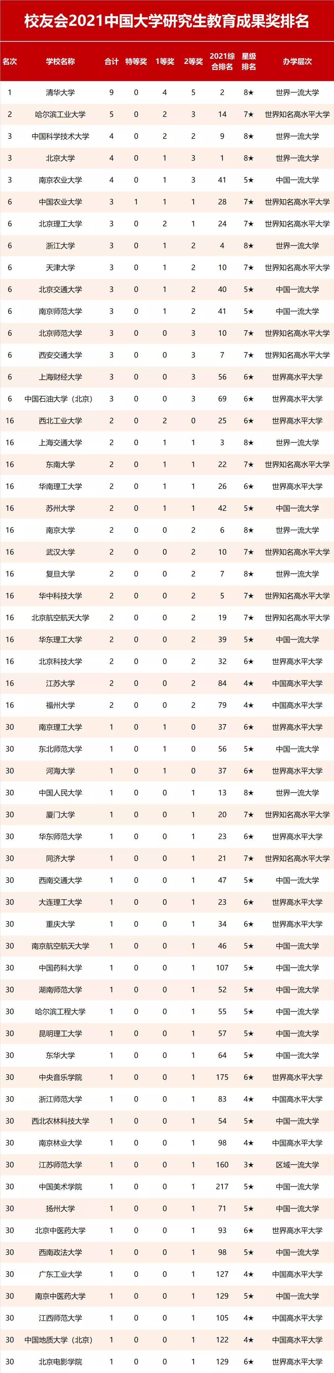 2021校友会中国大学研究生教育成果奖排名,清华大学第一