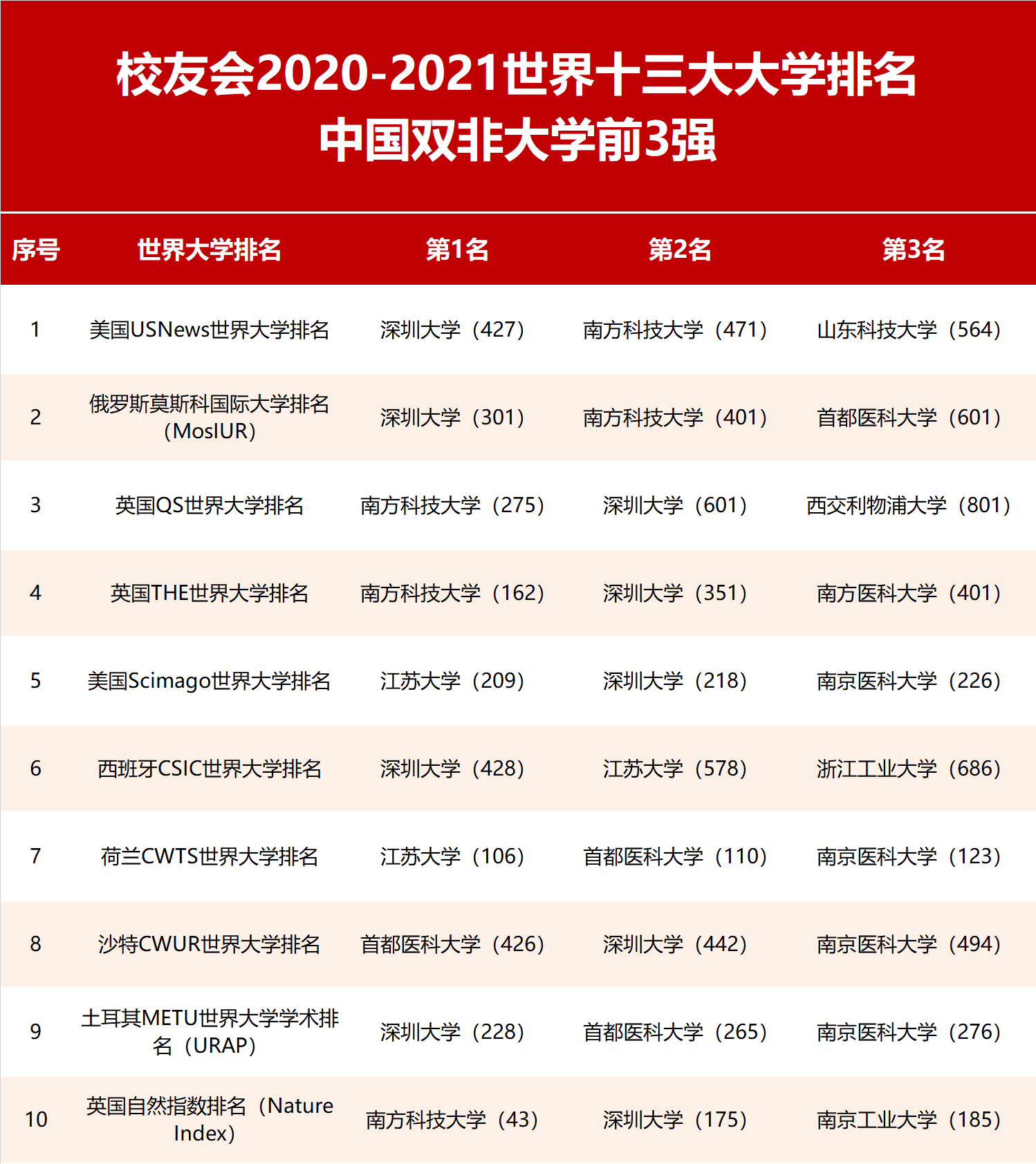 在2020-2021年世界十三大大学排名上榜的中国双非高校中,深圳大学包揽美国USNews、俄罗斯莫斯科(MosIUR)、土耳其URAP、西班牙CSIC、中国NTU等7个版本世界大学排名中国双非大学第一,全国领跑;南方科技大学勇夺英国THE、英国QS、英国自然指数等3个版本世界大学排名中国双非高校冠军;江苏大学摘得美国Scimago、荷兰CWTS等2个版本世界大学排名中国双非高校第一。首都医科大学夺得沙特CWUR世界大学排名中国双非高校第一。