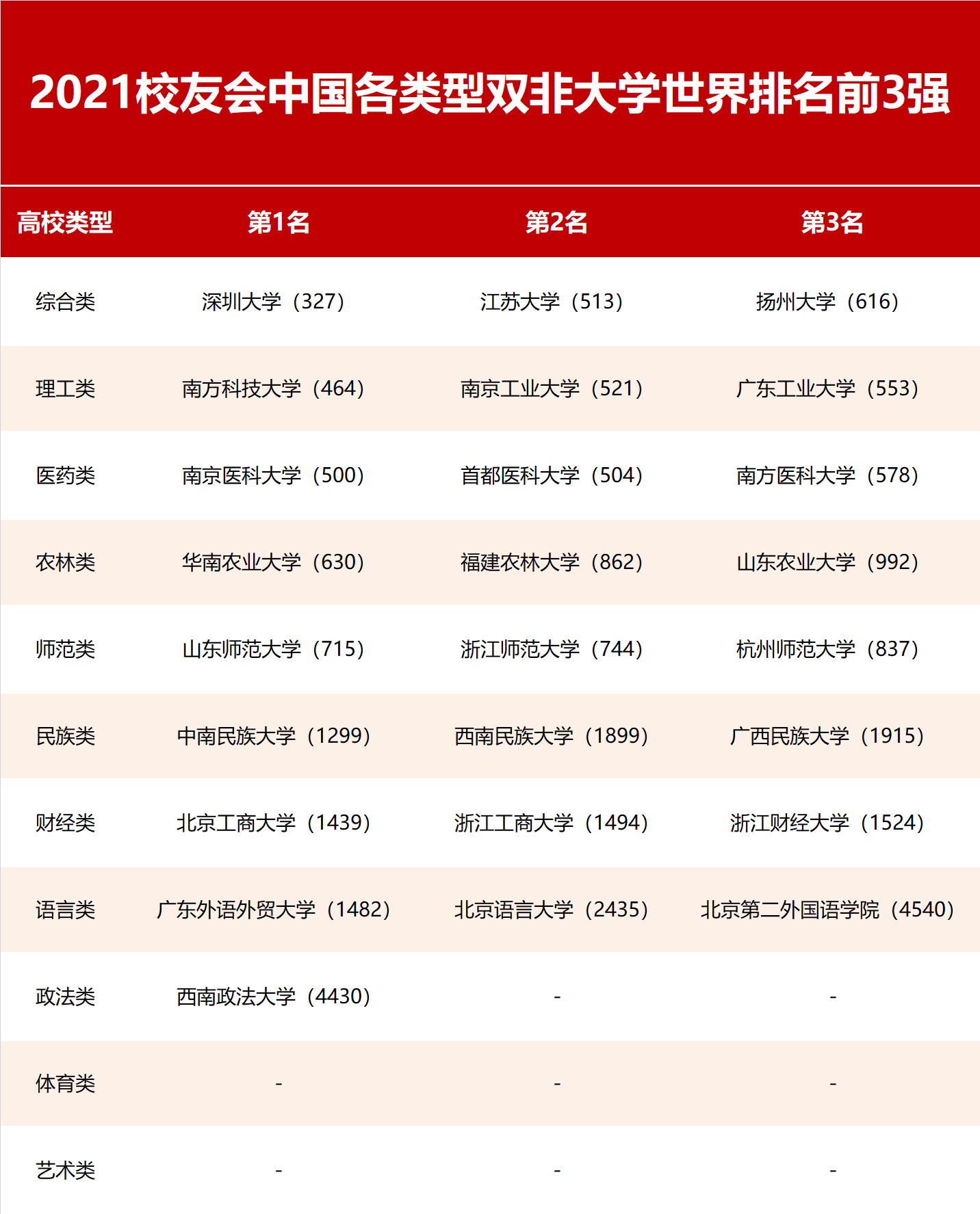 在最新2021中国各类型双非大学世界排名中,深圳大学位列综合类双非大学世界排名第一,南方科技大学位居理工类双非大学世界排名榜首,南京医科大学名列医药类双非大学世界排名第一,华南农业大学位列农林类双非大学世界排名榜首,山东师范大学占据师范类双非大学世界排名首位,中南民族大学位列民族类双非大学世界排名第一,北京工商大学高居财经类双非大学世界排名第一,广东外语外贸大学位居语言类双非大学世界排名第一,西南政法大学位列政法类双非大学世界排名第一;全国体育类和艺术类双非大学中没有高校跻身世界5000强。
