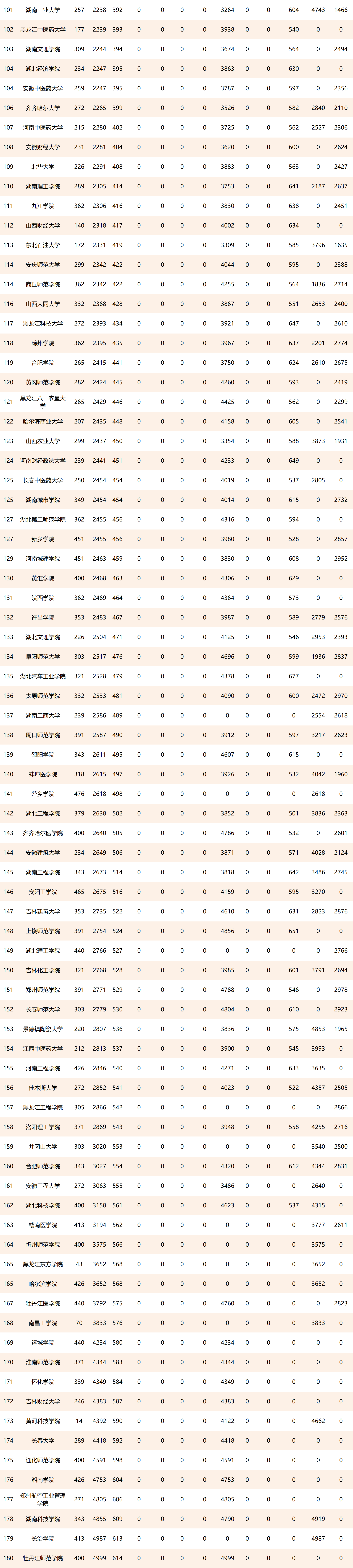 位列校友会2021中国中部地区大学世界排名前20强的其他高校依次是华中农业大学(第476名)、南昌大学(第531名)、合肥工业大学(第557名)、华中师范大学(第566名)、国防科技大学(第598名)、战略支援部队信息工程大学(第615名)、哈尔滨工程大学(第686名)、东北师范大学(第696名)、山西大学(第730名)、安徽大学(第769名)。值得关注的是,在中部地区双非大学中,战略支援部队信息工程大学、山西大学、哈尔滨医科大学、湘潭大学和湖北大学雄居2021中国中部地区双非大学世界排名前5强,跻身全球1000强,最有希望入围第二轮“双一流”建设高校名单。