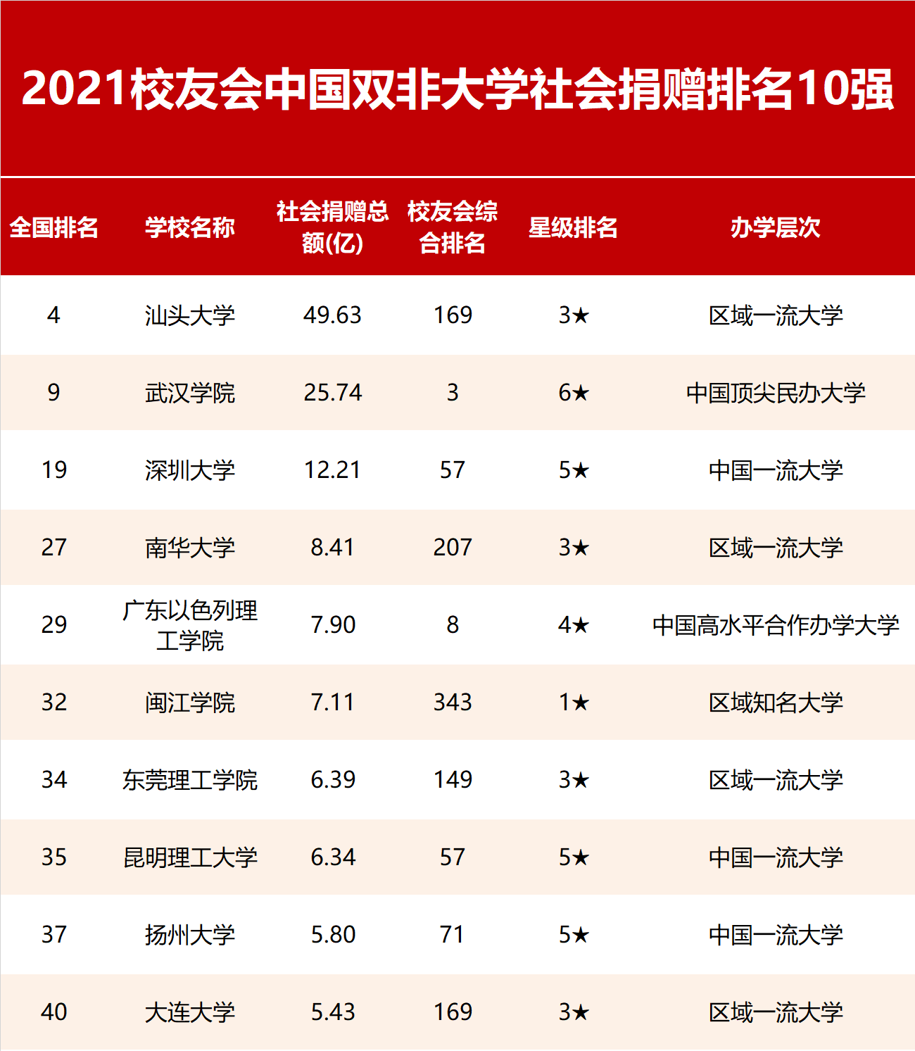 汕头大学雄居2021中国双非大学社会捐赠排名榜首,深圳大学12.21 亿跻身前3甲