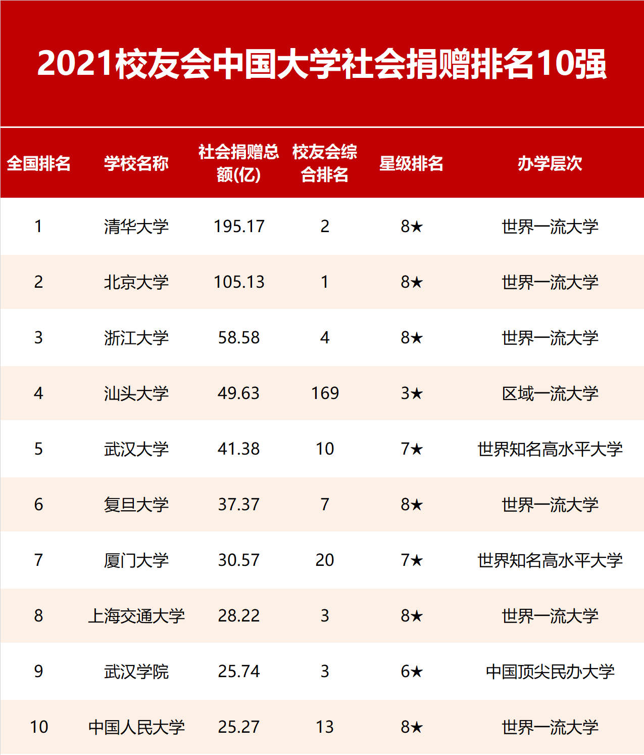 榜单显示,清华大学以195.17亿元的捐赠总额,问鼎2021校友会中国大学社会捐赠排名榜首,再次刷新中国大学社会捐赠总额最高纪录。北京大学105.13亿元,位列第2;浙江大学58.58亿,位列第3;武汉大学捐赠突破40亿,挺进全国前5强。引人关注的是,在全国上榜的双非高校中,汕头大学、武汉学院和深圳大学社会捐赠超10亿元,雄居2021校友会中国双非大学社会捐赠排名前3甲,挺进全国前20强。