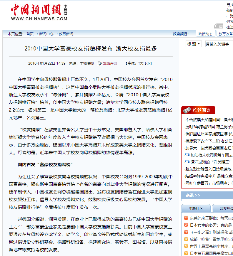 【中国新闻网:中国大学富豪校友捐赠榜发布 浙大校友捐最多】