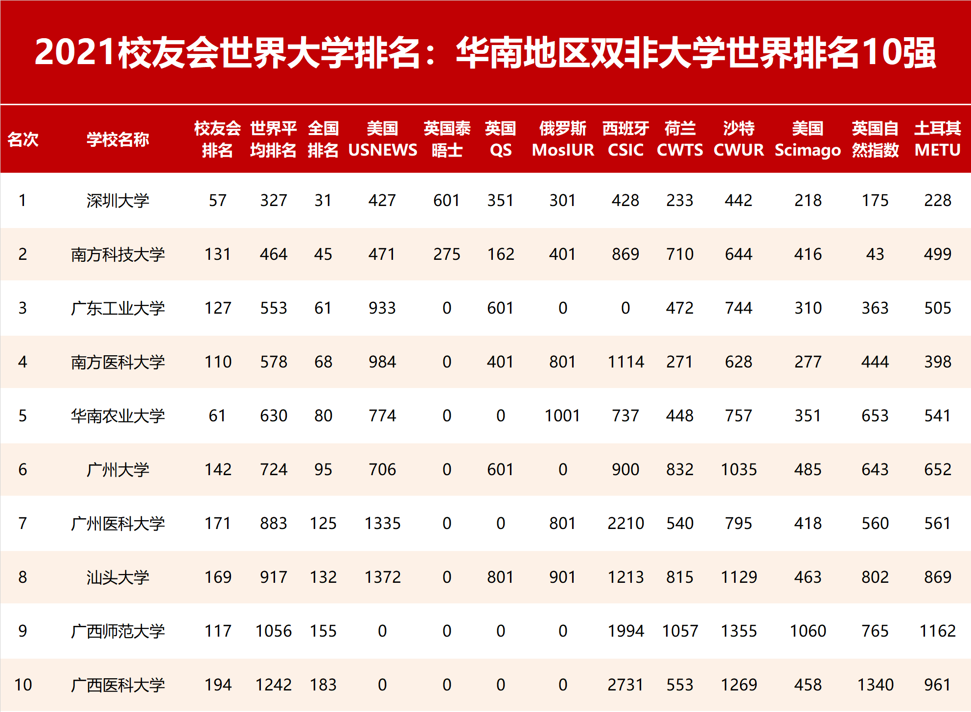 2021校友会世界大学排名:华南地区大学世界排名,中山大学第一,深圳大学第三