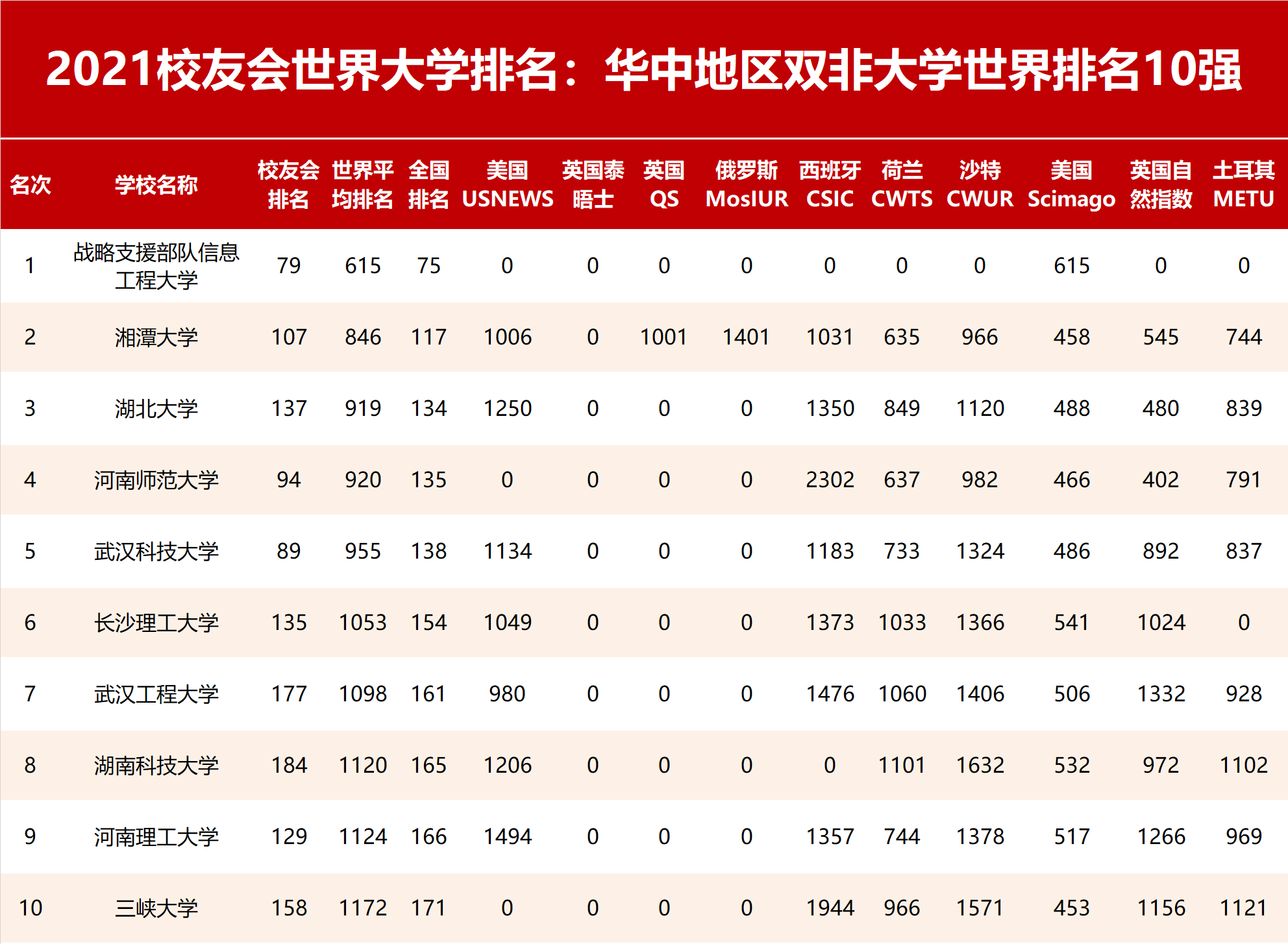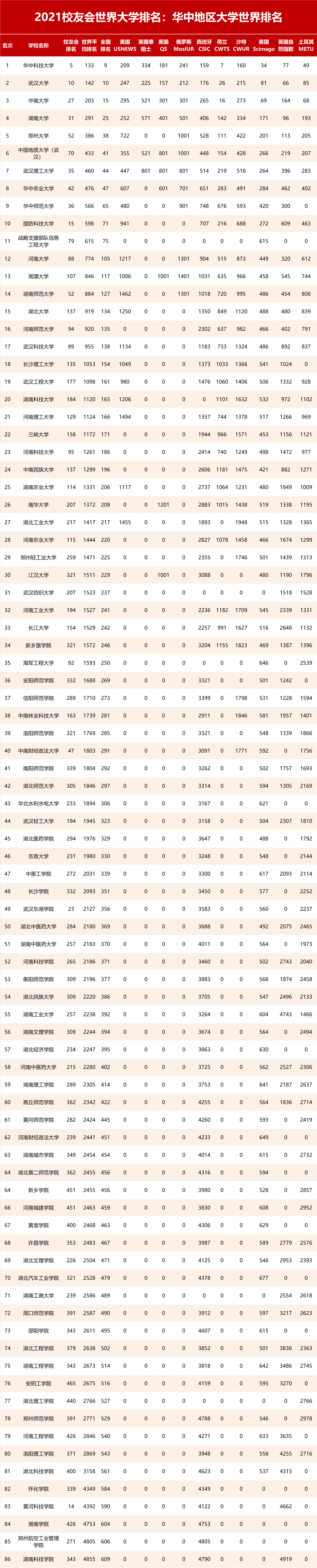 原创2021校友会世界大学排名:华中地区大学世界排名,华中科技大学第一,武汉大学第二