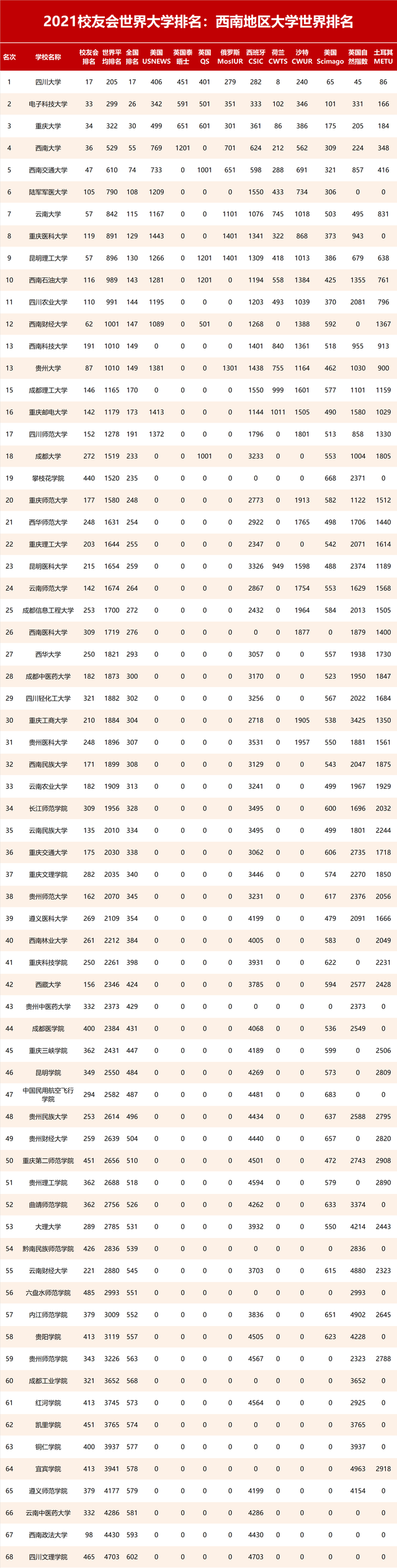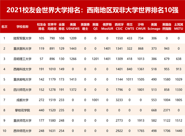 2021校友会世界大学排名:西南地区大学世界排名,重庆大学前三