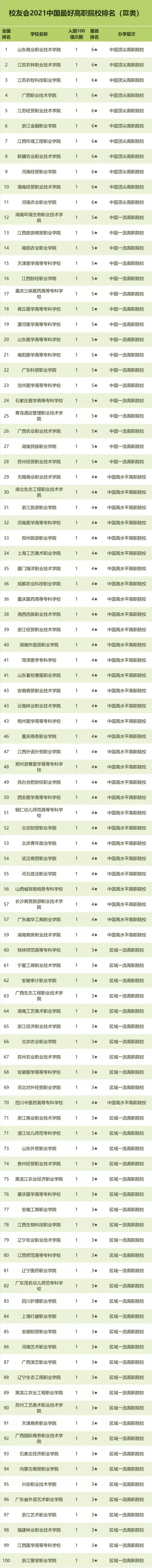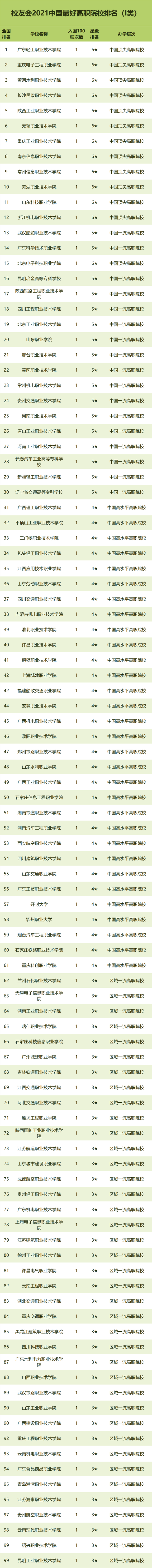 在最新2021中国最好高职院校排名中,广东轻工职业技术学院、重庆电子工程职业学院、黄河水利职业技术学院位列2021中国最好高职院校排名I类前三强。深圳职业技术学院、九江职业技术学院、深圳信息职业技术学院位列2021中国最好高职院校排名类前三强。山东商业职业技术学院、江苏农林职业技术学院、江苏农牧科技职业学院位列2021中国最好高职院校排名类前三强。