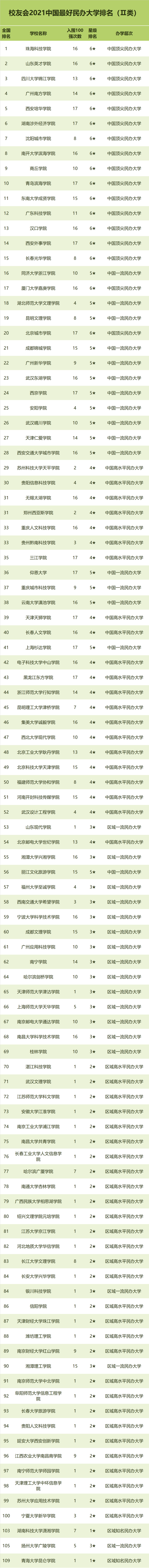 在最新校友会2021中国最好民办大学排名中,武昌首义学院、文华学院、三亚学院位列2021中国最好民办大学排名I类前三名。珠海科技学院、山东英才学院、四川大学锦江学院位列2021中国最好民办大学排名类前三名。西安欧亚学院、昆明城市学院、郑州工商学院、武汉学院位列2021中国最好民办大学排名类前三名。