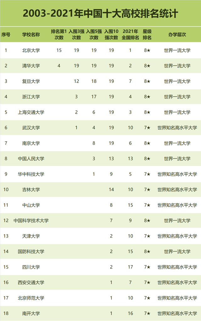 2003-2021年,中国十大高校的争夺最为激烈,全国共有18所高校入围中国大学排名10强,均为国家世界一流大学建设A类高校。其中,北大、清华、上交、浙大、复旦、南大、武大等7校的表现最为优秀,连续19年蝉联全国十强,雄居“中国最好大学第一方阵”。2021年,华中科技大学、中国科学技术大学、天津大学、吉林大学等高校蝉联全国10强,西安交通大学、北京师范大学首次跻身全国10强,中山大学、南开大学、四川大学等5所高校跌出全国10强行列。