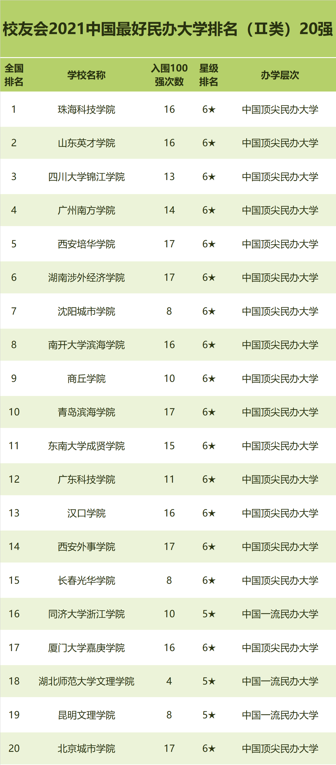 其中,珠海科技学院16次跻身2003-2021年中国民办大学排名100强,雄居2021中国最好民办大学排名(类)首位,荣获中国最好民办大学美誉。山东英才学院(16次)第2,四川大学锦江学院(13次)第3,广州南方学院(14次)第4,西安培华学院(17次)第5,湖南涉外经济学院(17次)第6,沈阳城市学院(8次)第7,南开大学滨海学院(16次)第8,商丘学院(10次)第9,青岛滨海学院(17次)第10。