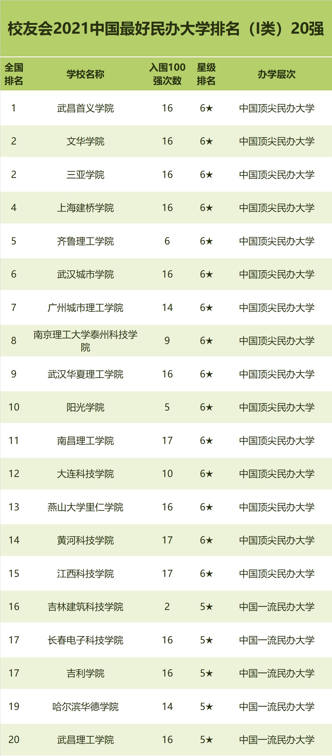 榜单显示,2003-2021年,武昌首义学院16次赢得中国民办大学排名第一,雄居2021中国最好民办大学排名(I类)榜首,夺得中国最好民办大学桂冠。文华学院(16次)第2,三亚学院(16次)第2,上海建桥学院(16次)第4,齐鲁理工学院(6次)第5,武汉城市学院(16次)第6,广州城市理工学院(14次)第7,南京理工大学泰州科技学院(9次)第8,武汉华夏理工学院(16次)第9,阳光学院(5次)第10。