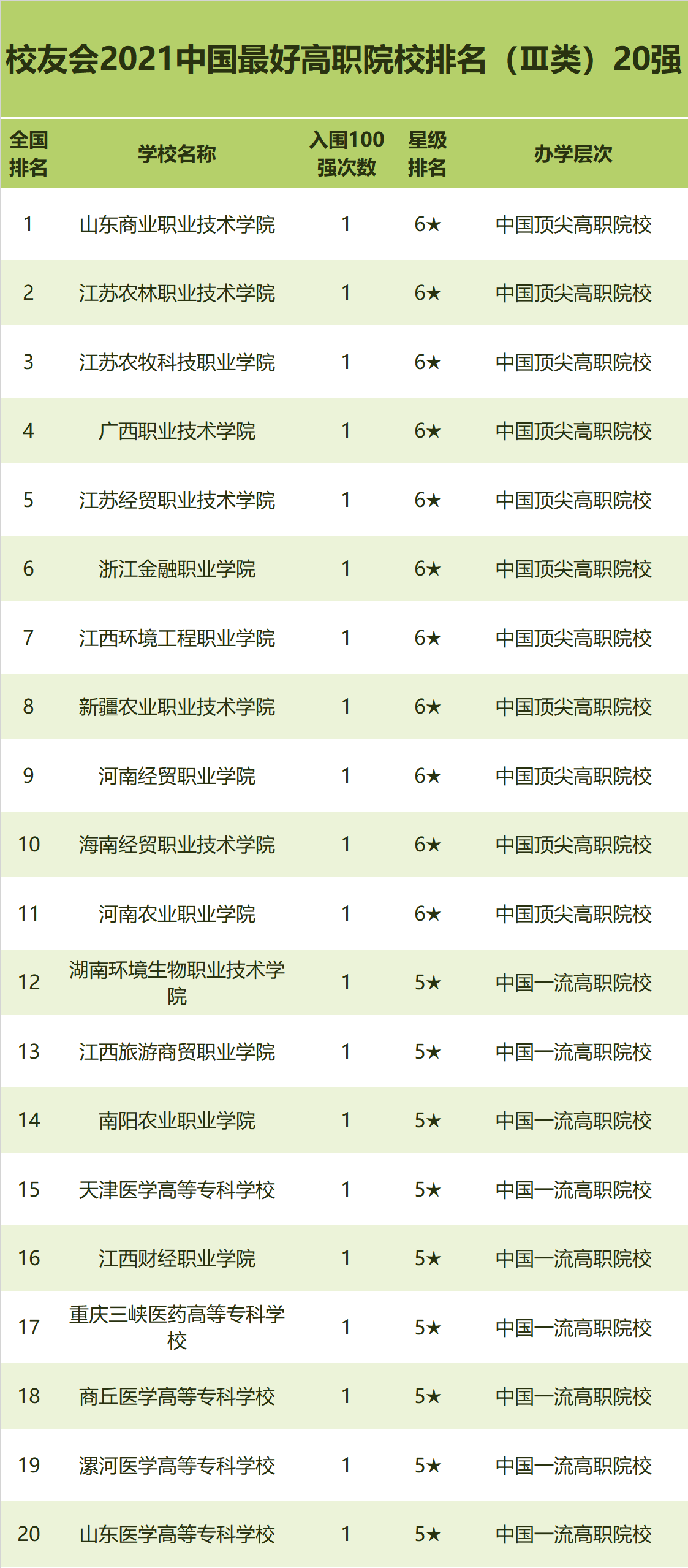 校友会中国最好大学排名前身是“中国最佳大学排行榜”,首次发布于2012年,旨在为社会公众了解、对比全国高校的办学实力与水平提供参考。校友会中国最好高职院校排名依据中国民办高校入围2003-2021年中国高职院校排名100强情况统计得出。2021校友会中国高职院校排名完整榜单请查阅“艾瑞深研究院”独家编撰,由“科学出版社”公开出版的《2021校友会中国大学排名—高考志愿填报指南》。