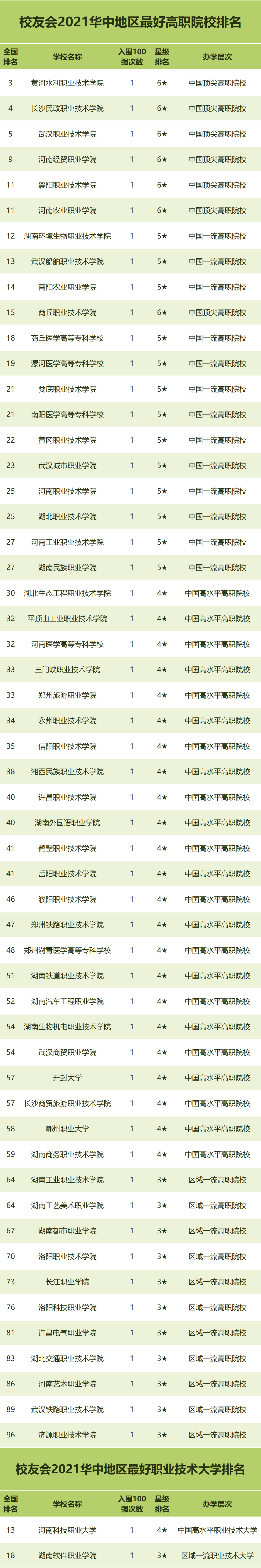 在最新2021中国最好高职院校排名中,广东轻工职业技术学院、深圳职业技术学院、山东商业职业技术学院分列2021中国最好高职院校排名榜首。黄河水利职业技术学院、长沙民政职业技术学院、武汉职业技术学院、河南经贸职业学院、襄阳职业技术学院位列2021校友会华中地区最好高职院校排名前五名。